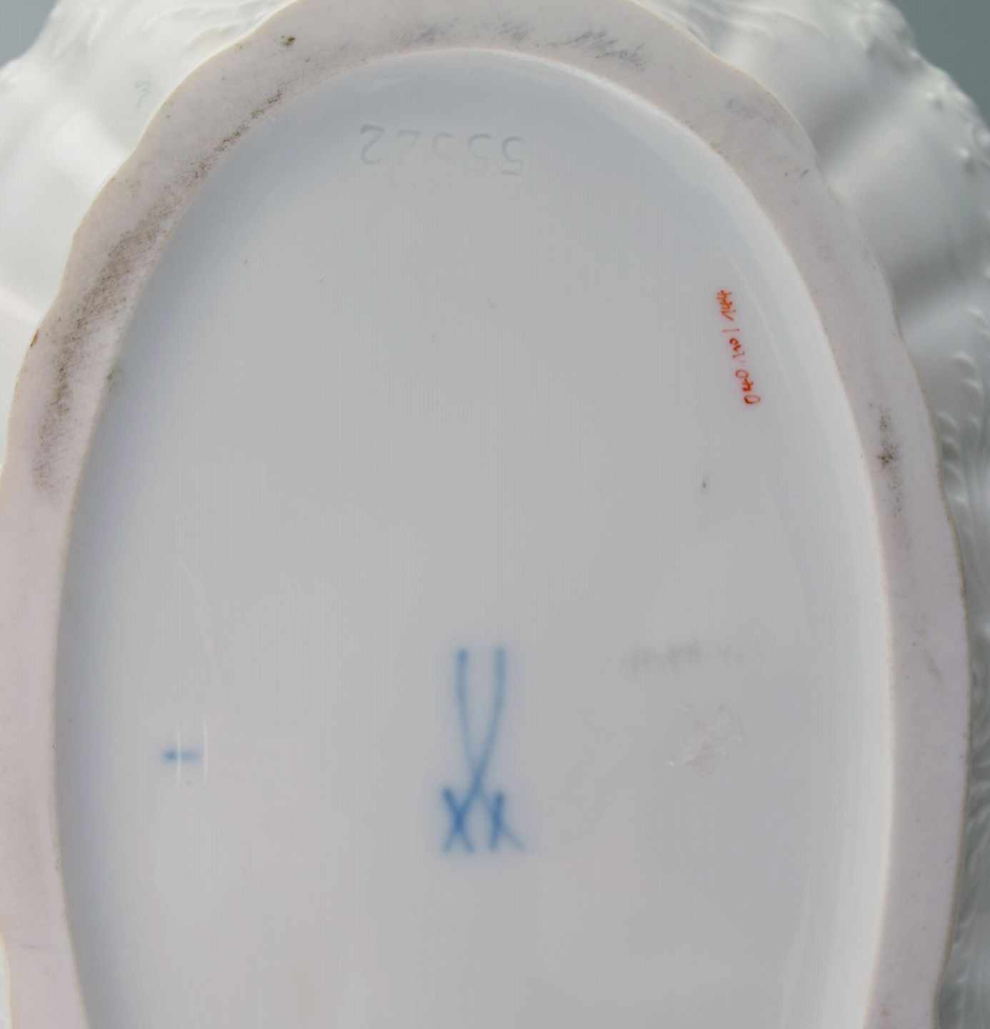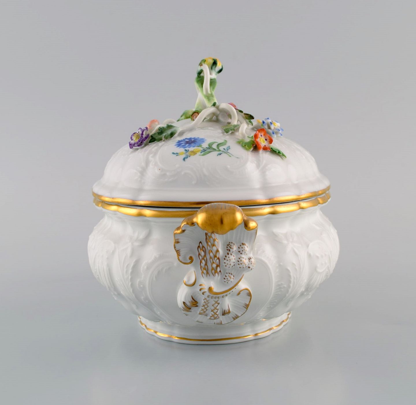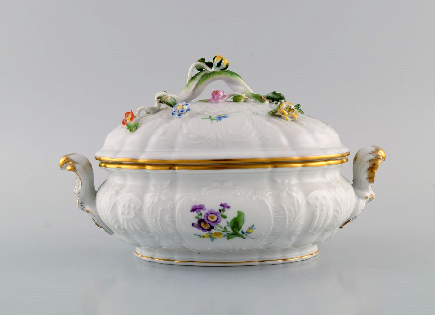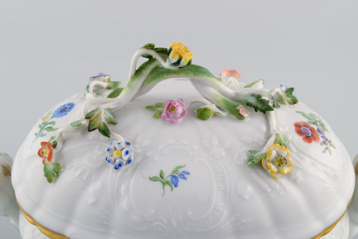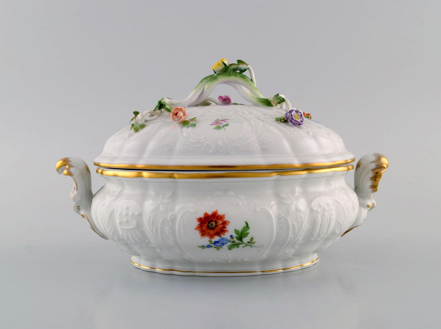 Meissen lågterrin i porcelæn med håndmalede blomster og guldkant. Låg modeleret med blomster og bladværk. 1920'erne.