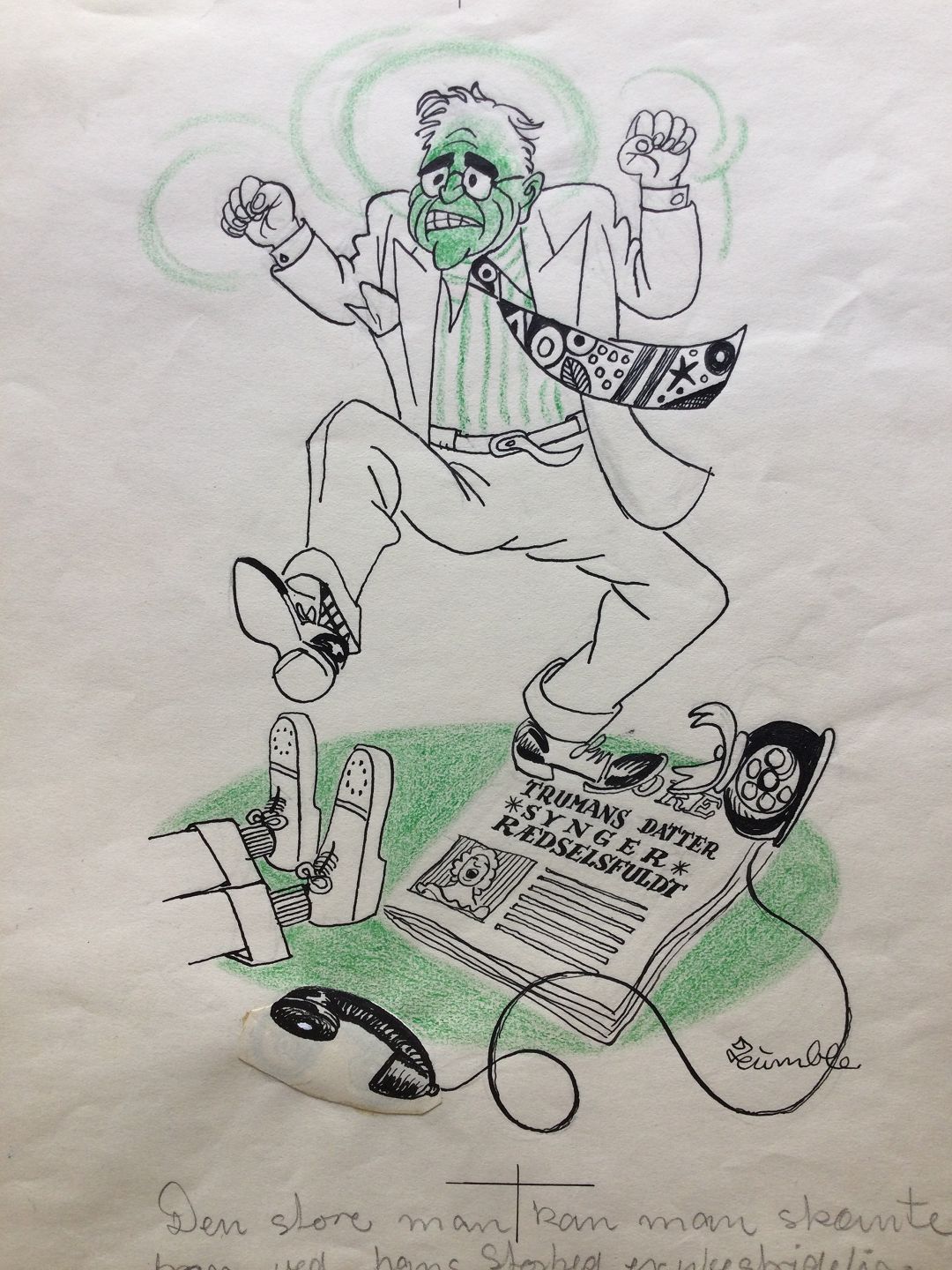 Text available in Danish: Tegning af Georg Humble - USA's præsident Harry S. Truman efter at have læst en avisartikel og datterens manglende talent for sang.