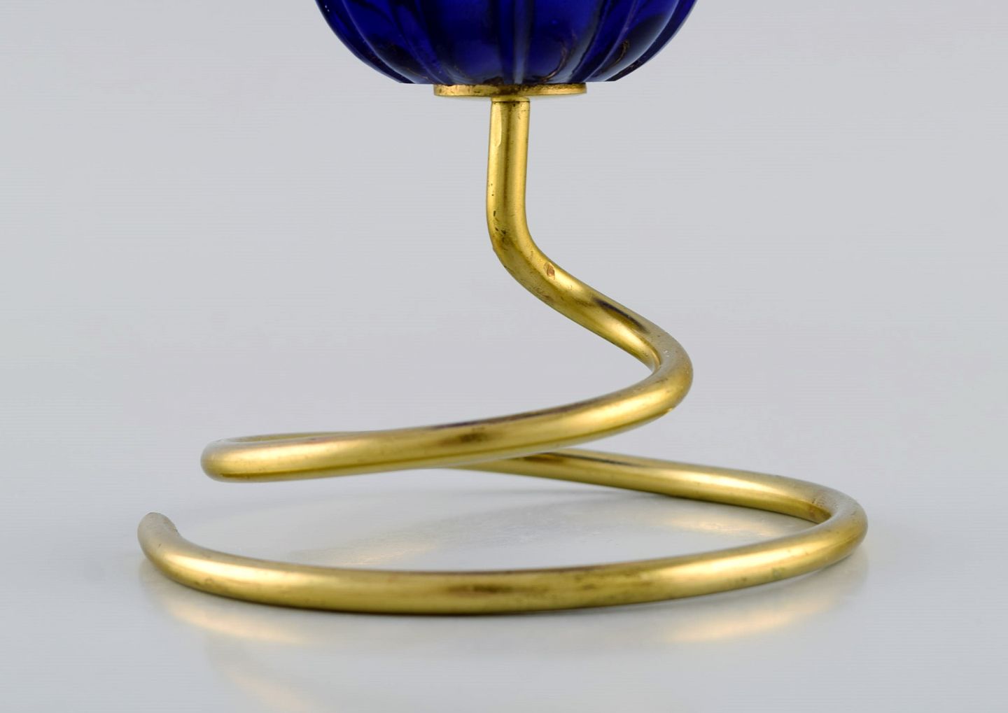 Gunnar Ander for Ystad Metall. Two candlesticks in brass and blue art glass shaped like flowers. 1950s.