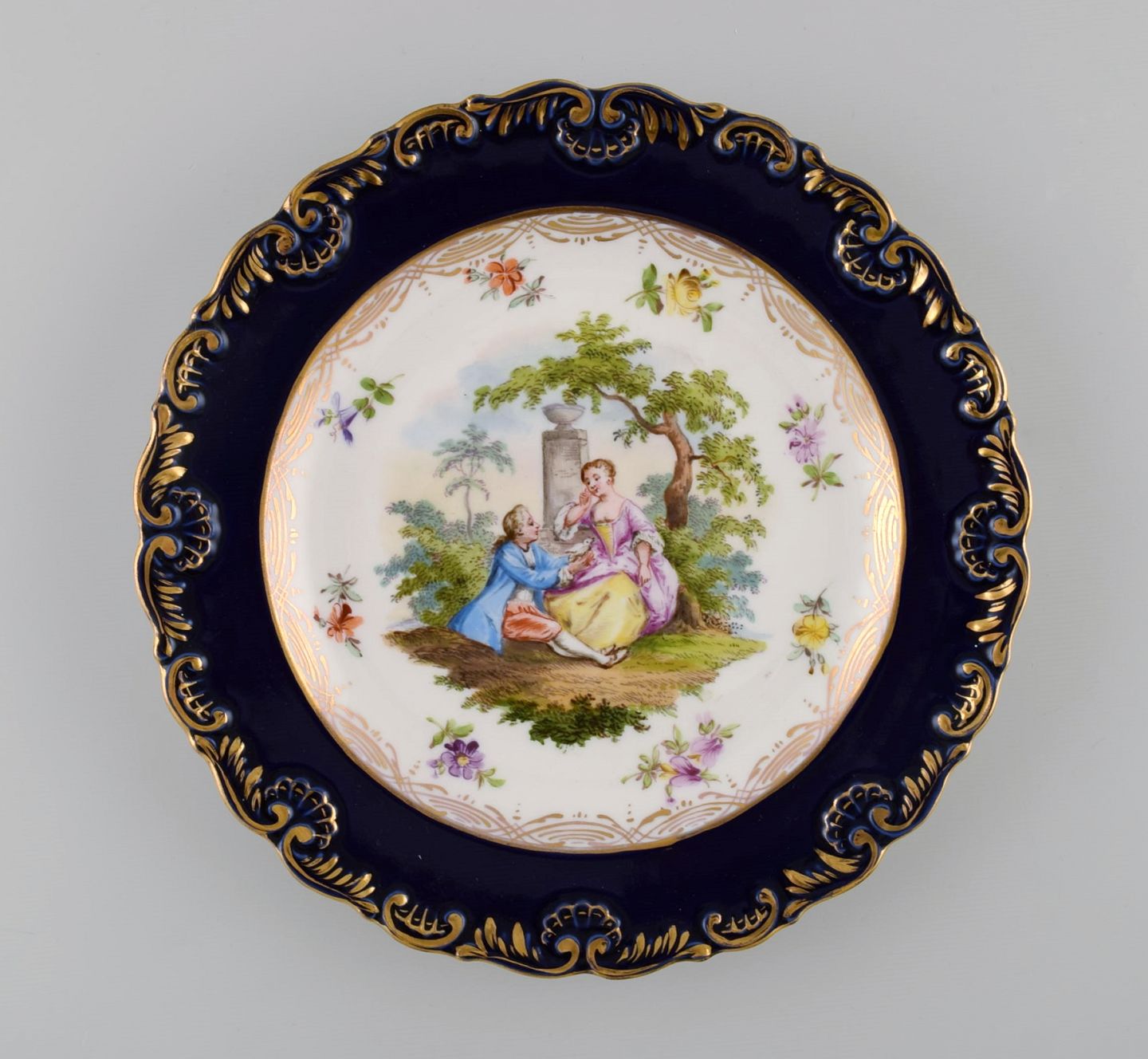 Antik Meissen tallerken i håndmalet porcelæn. Romantisk scene, blå kant med gulddekoration. Sent 1800-tallet.
