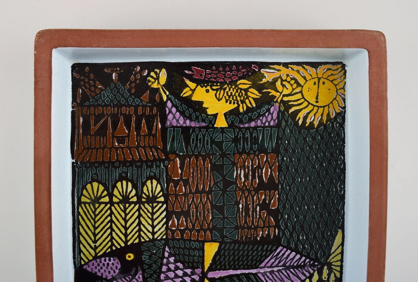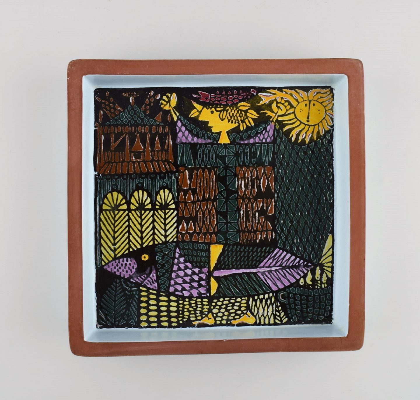 Stig Lindberg (1916-1982) for Gustavsberg. Karneval fad / skål i håndmalet stentøj. Svensk design, midt 1900-tallet.