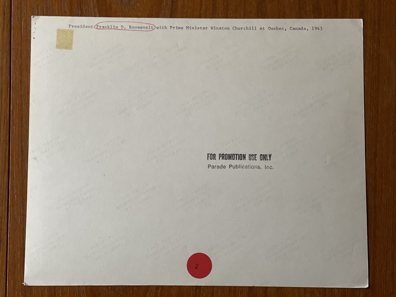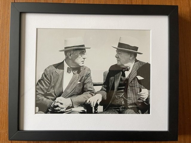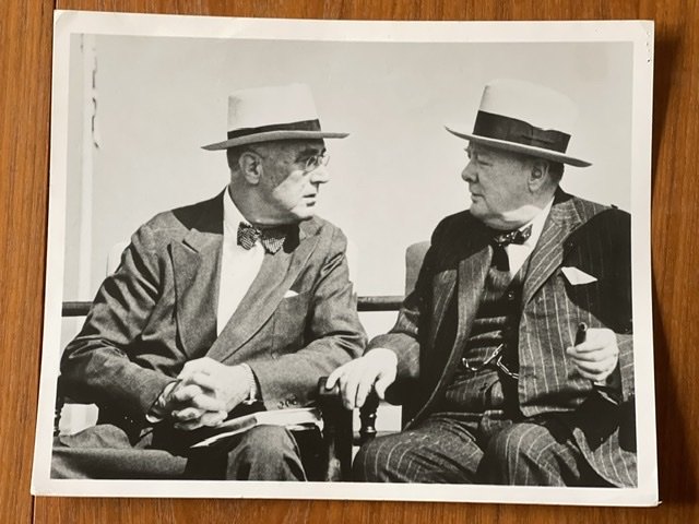 Original black-and-white vintage photo of Winston Churchill, English Prime Minister, and Franklin D. Roosevelt, President of the United States, during the first top-secret Quebec conference in 1943, codenamed Quadrant, which included discussions about Operation Overlord, D day in France. Gelatin silver. he picture is taken during World War II