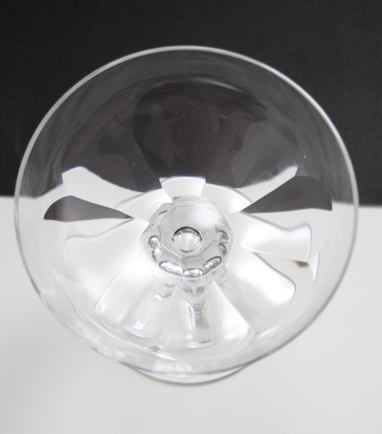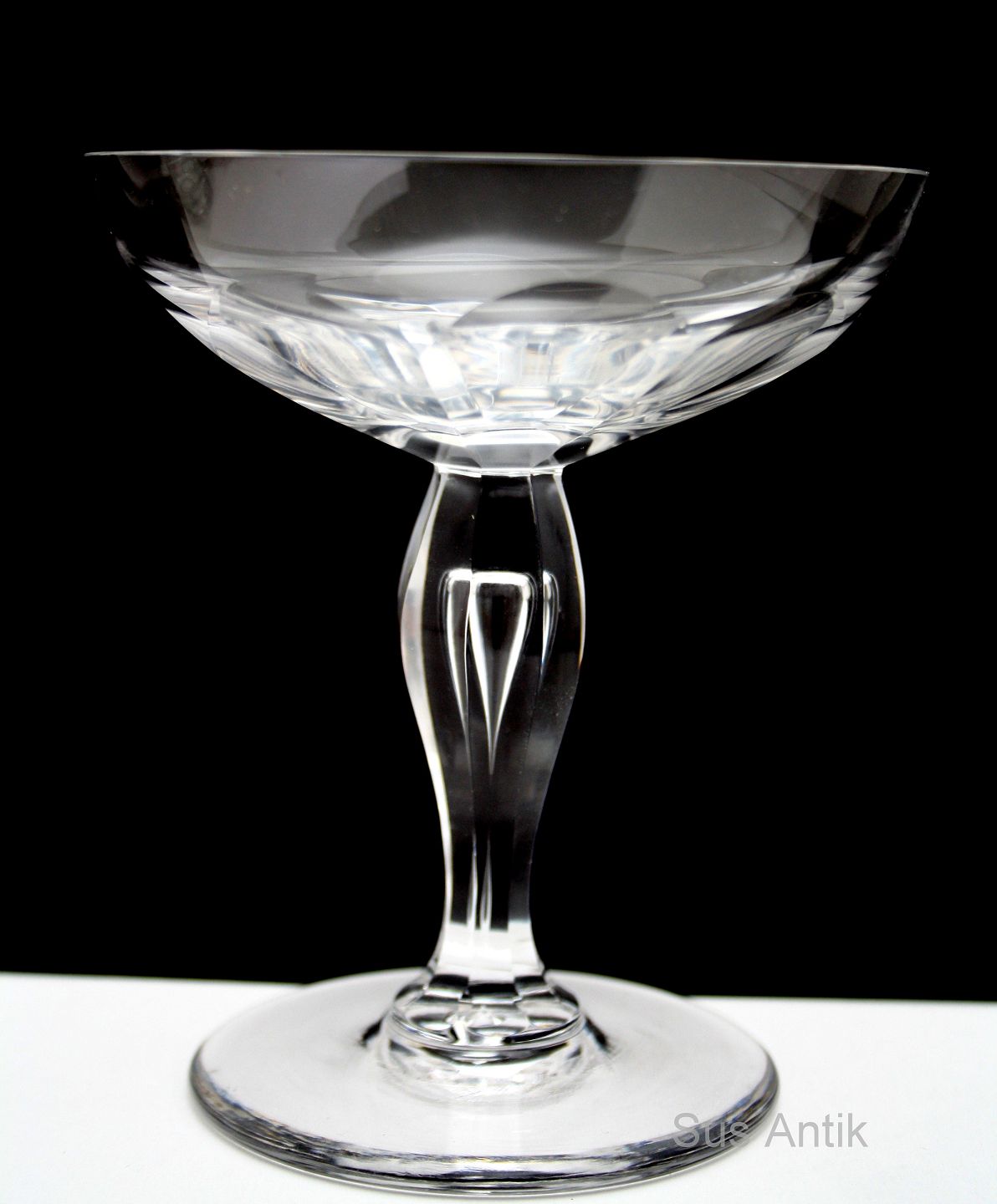 Val Saint Lambert, Belgien produceret på licens på Holmegaard 1917-1934. Paul krystalglas. Champagneskål med lav bred kumme med store facetslibninger på omvendt balusterformet hul og dråbe facetslebet stilk på flad fod. Højde 11,3 cm. Diameter 9,7 cm. Fin stand. Pris: 400 kr. stk. Lager: 9