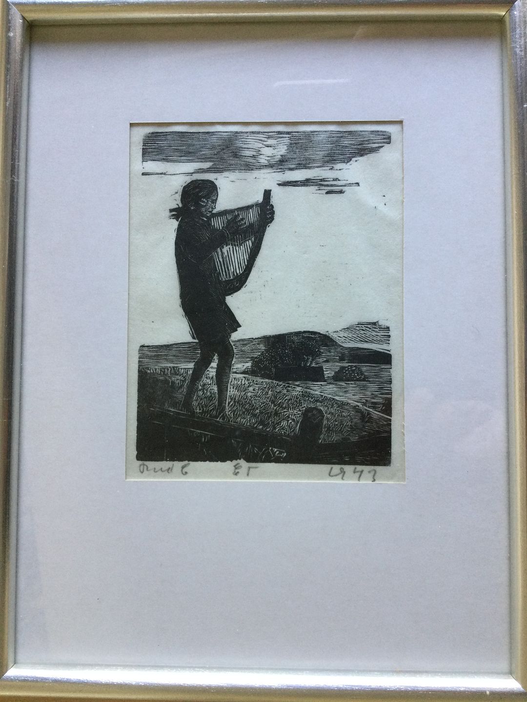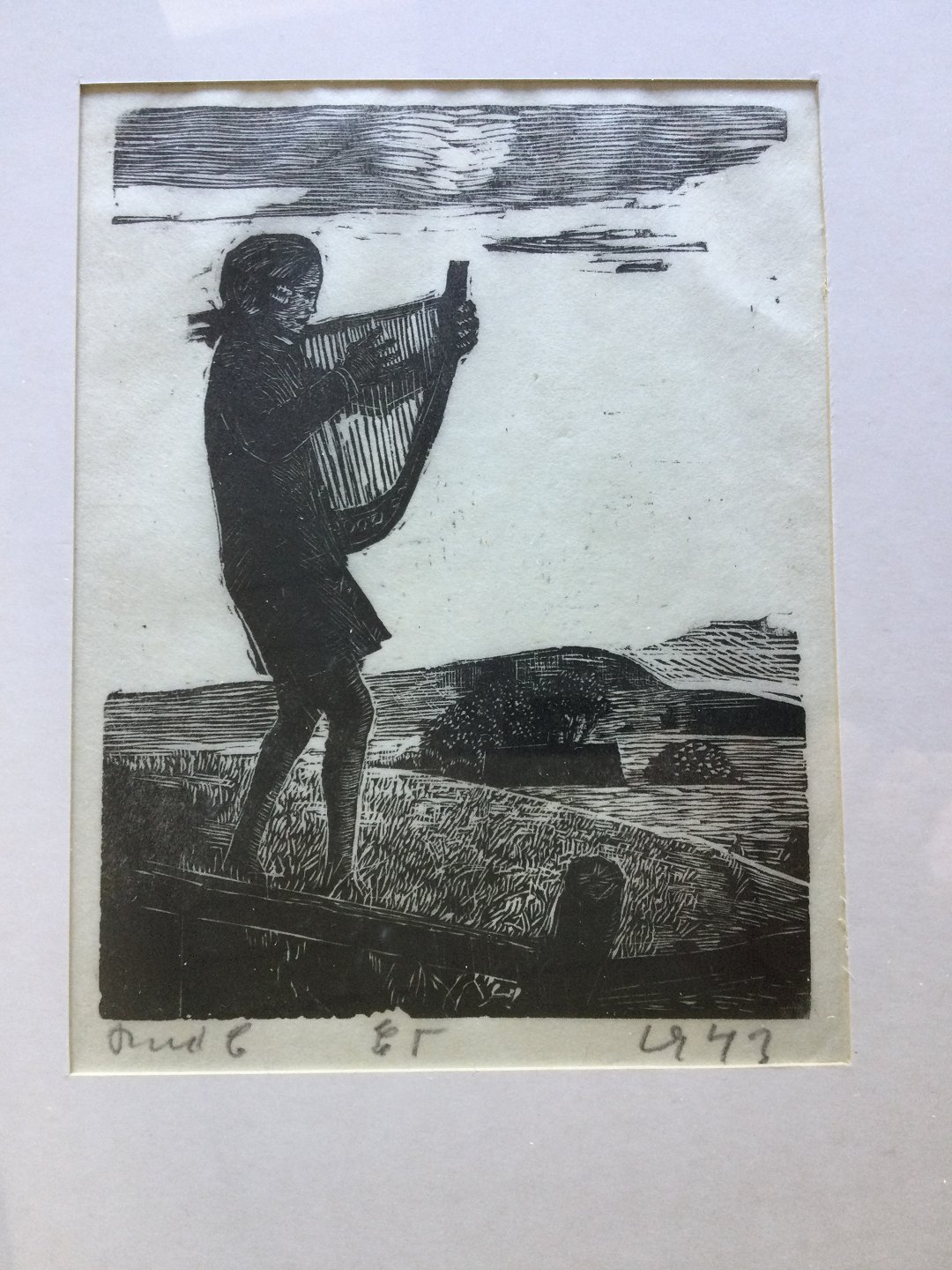 Træsnit af Povl Christensen 1943 - Pige med harpe.
