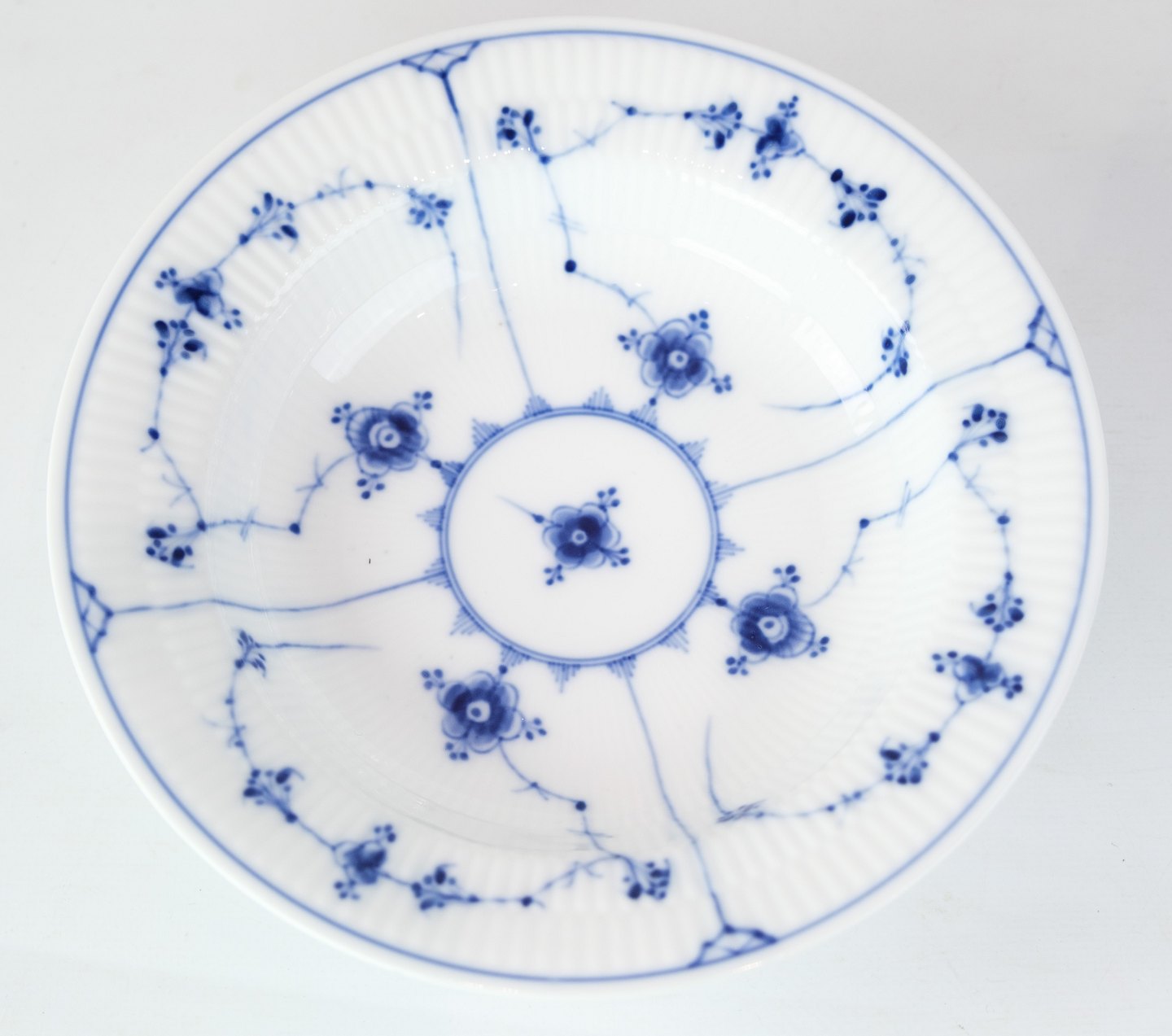Royal Copenhagen musselmalet riflet dyb tallerken fra den kongelig porcelænsfabrik.