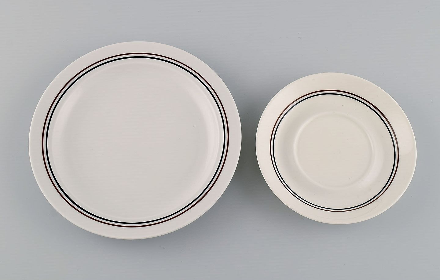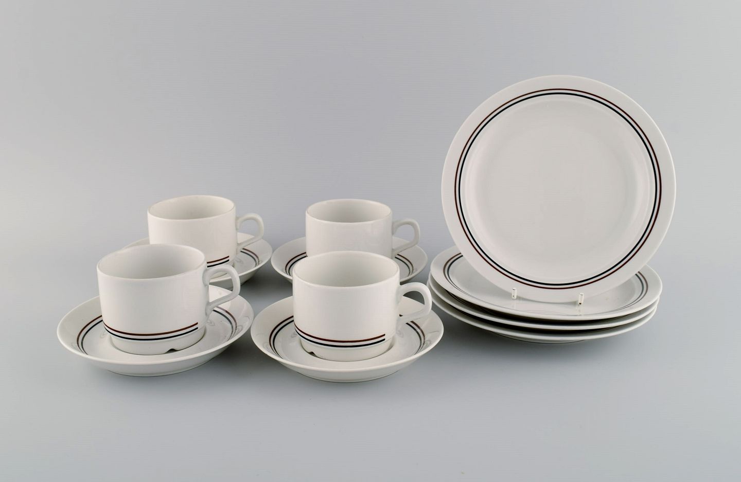 Bestående af fire kaffekopper med underkopper og fire tallerkener i glaseret porcelæn.