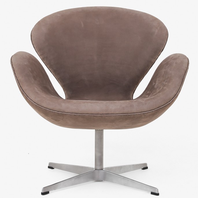 AJ 3320 - Nybetrukket 'Svanen'-lænestol i Royal Nubuck-læder (farve: Cinnamon) på ny fod af aluminium. KLASSIK tilbyder Svanen i læder efter eget valg. Kontakt os venligst for mere information.