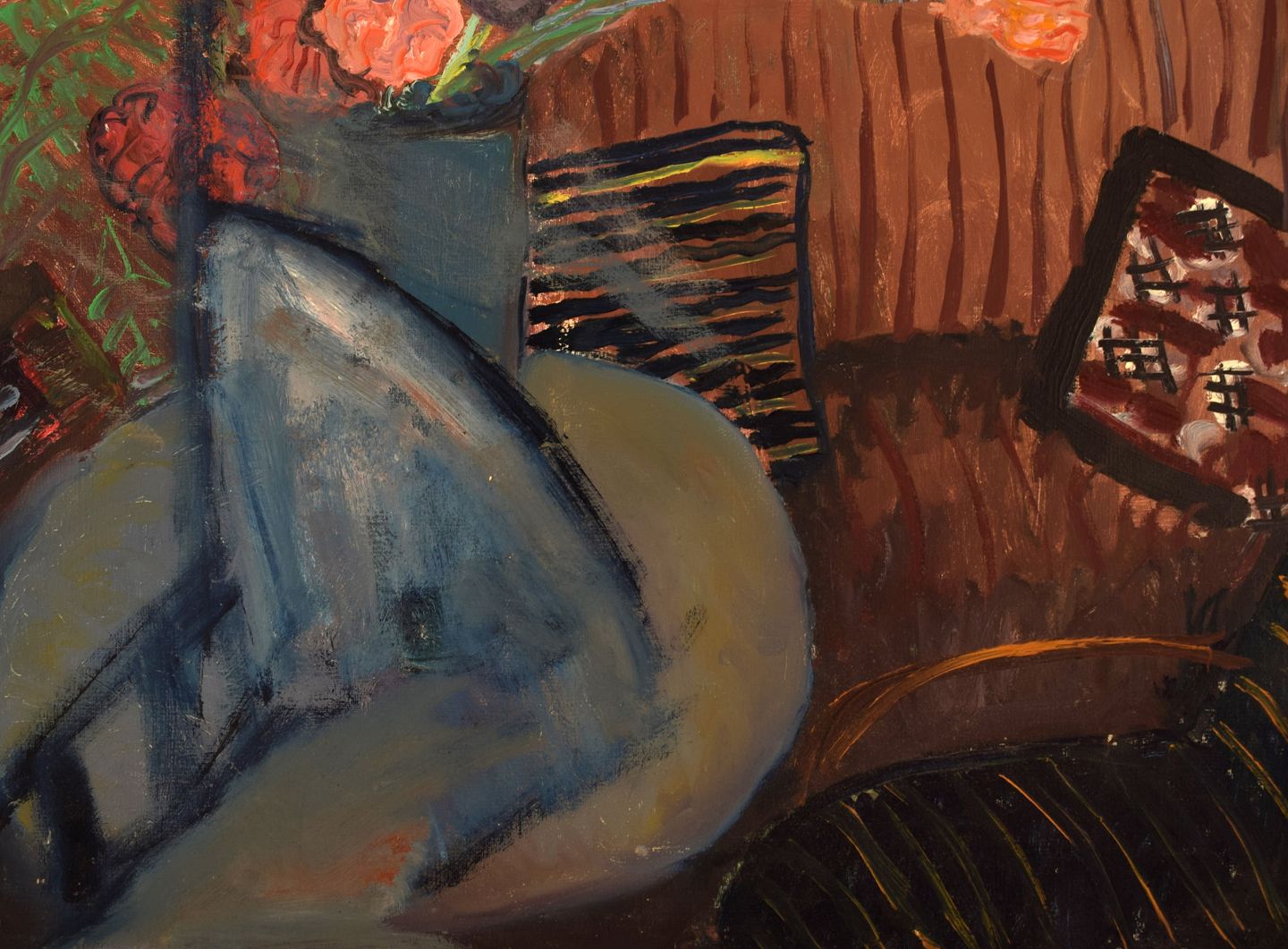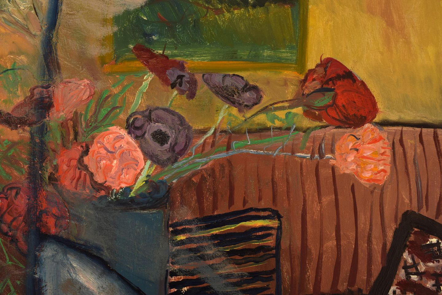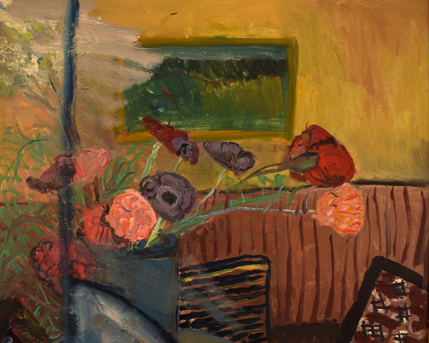 Dagny Cassel (1908-1988), Sverige. Olie på lærred. Modernistisk interiør med blomster. Midt 1900-tallet.
