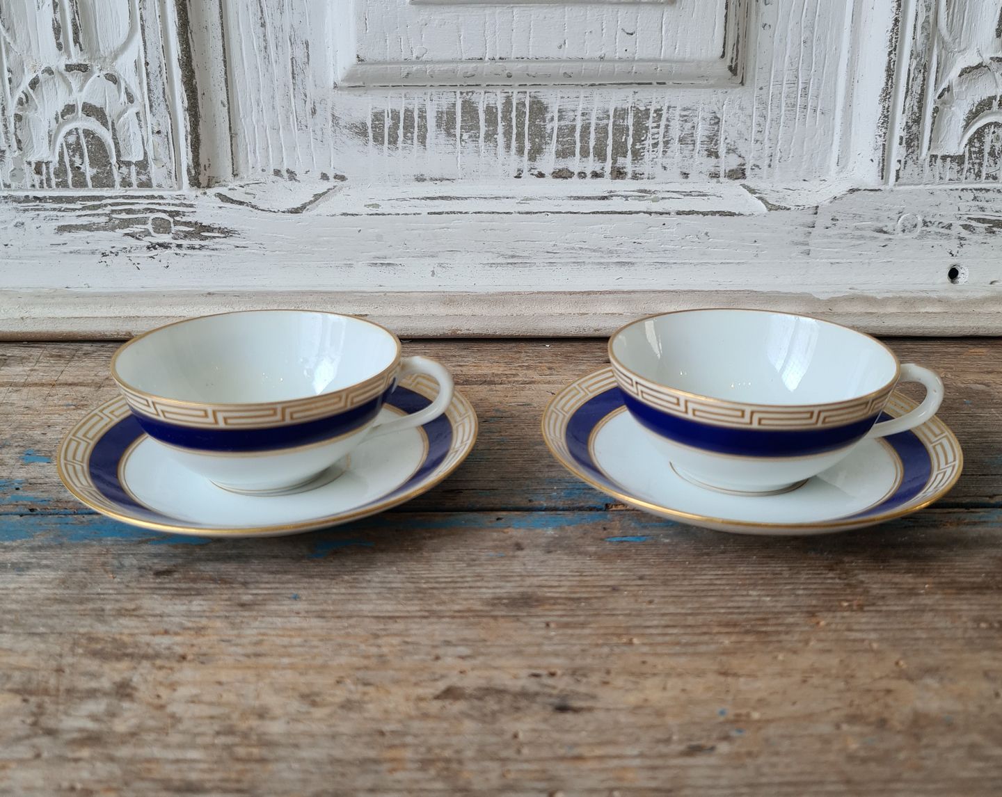 Text zugänglich auf Dänische: Set på 5 B&G små kaffekopper dekoreret med kongeblå fane, græsk evighedsmønster og våbenskjold i guld