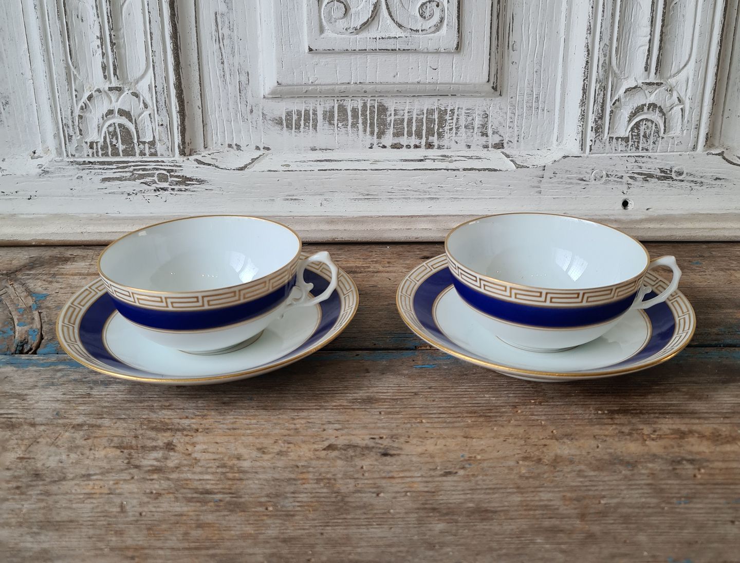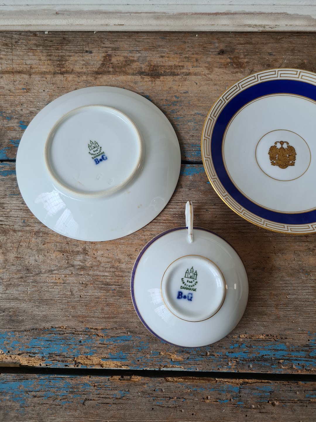 Sæt på 11 B&G tekopper dekoreret med kongeblå fane, græsk evighedsmønster og våbenskjold i guld.