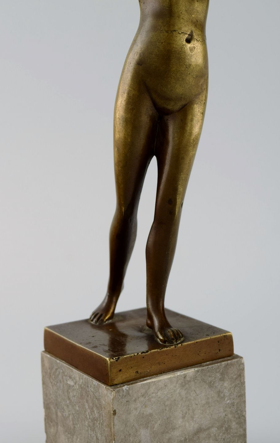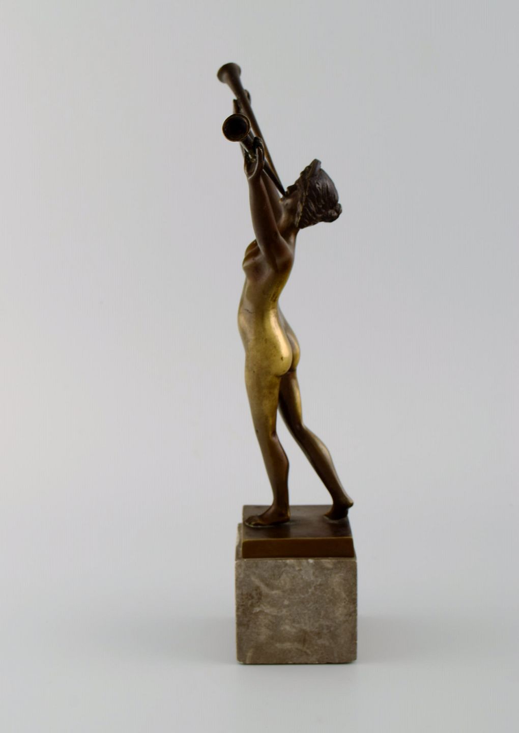 Art deco bronzeskulptur på marmorbase. lurblæsende nøgen kvinde. 1920/30'erne.