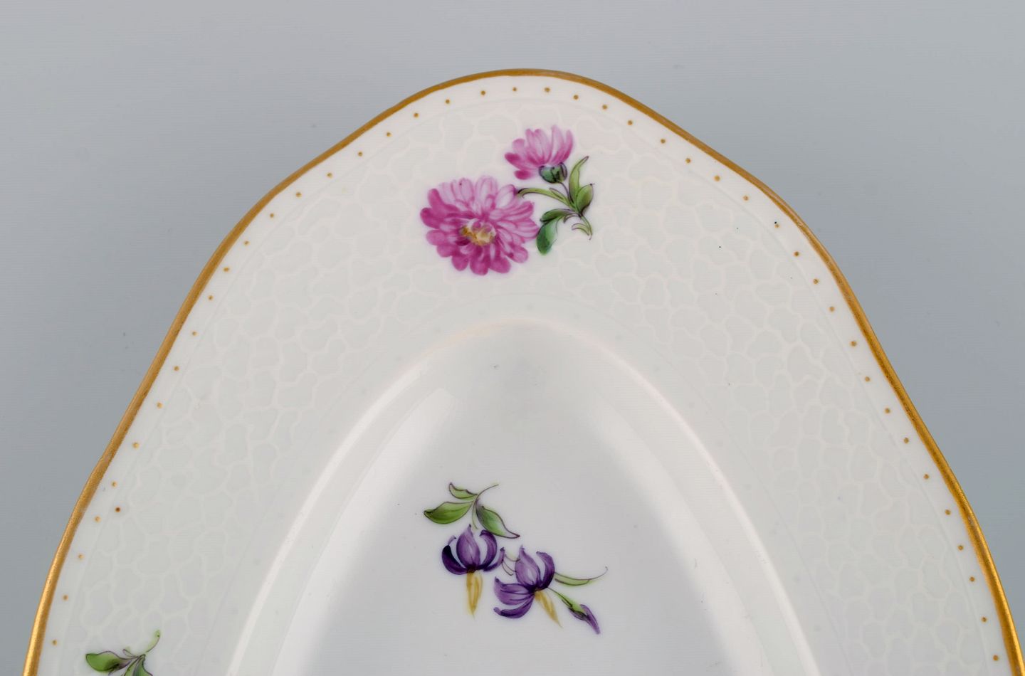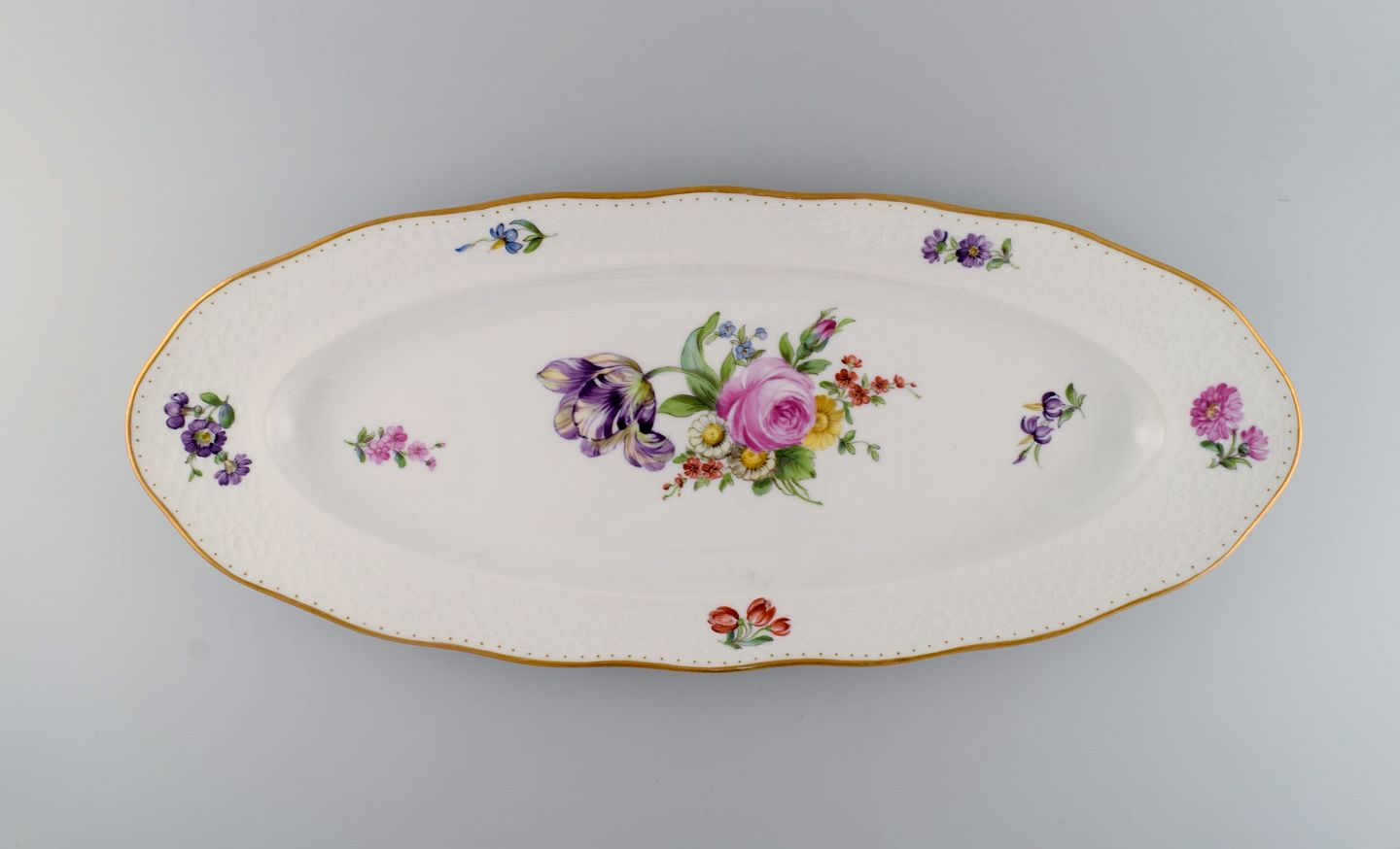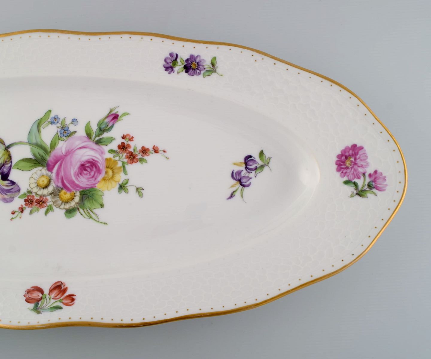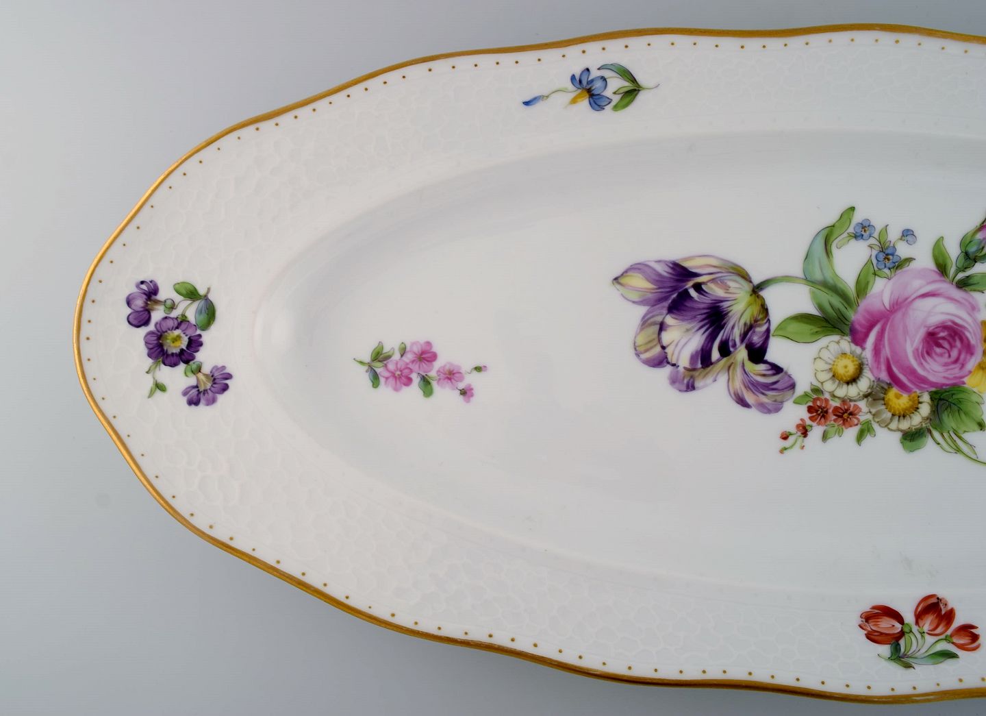 Royal Copenhagen Saksisk Blomst. Kolossalt fiskefad i porcelæn med håndmalede blomster og guldkant. 1800-tallet.