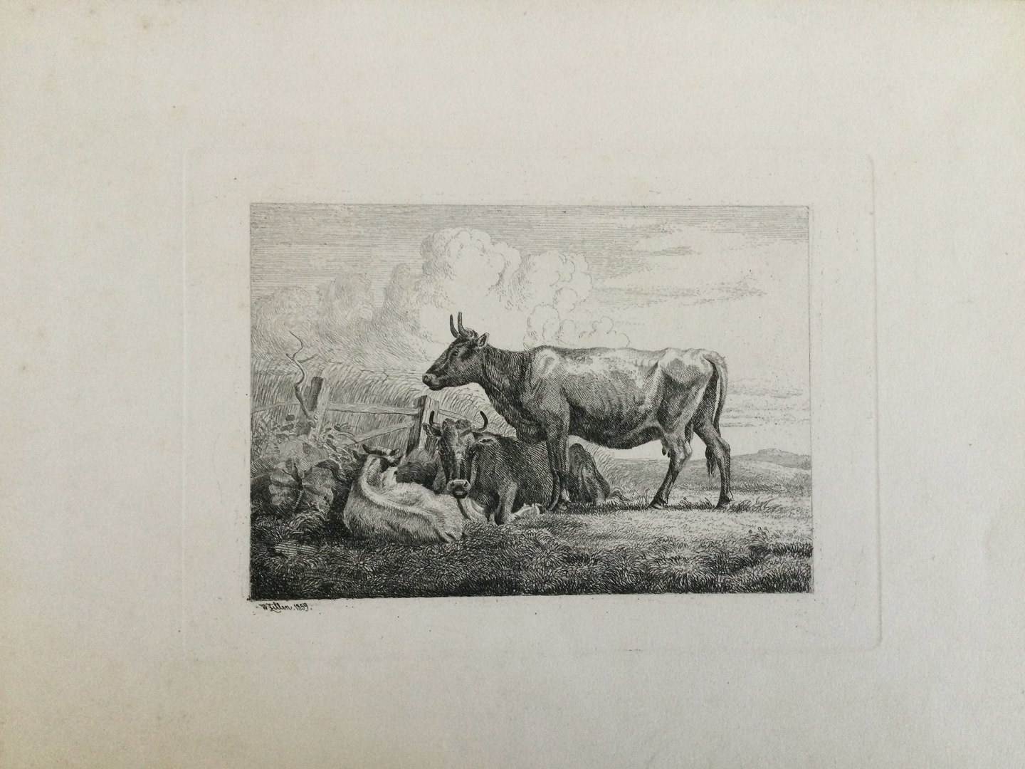 Radering af Johannes Vilhelm Zillen 1859 - Køer ved et gærde.