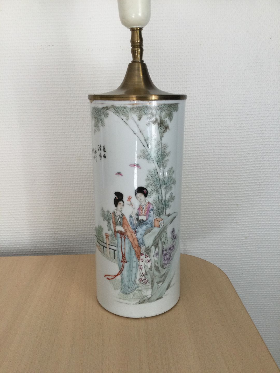 Polykromt dekoreret med skrifts tegn og scene med personer.