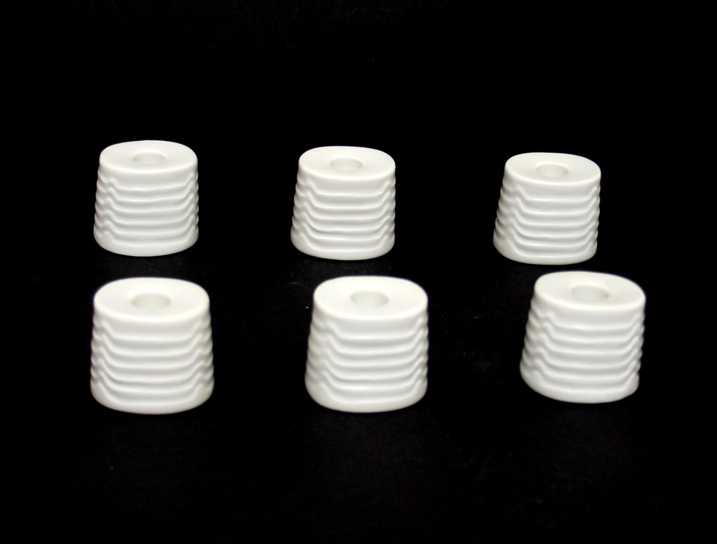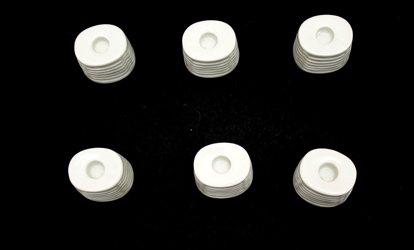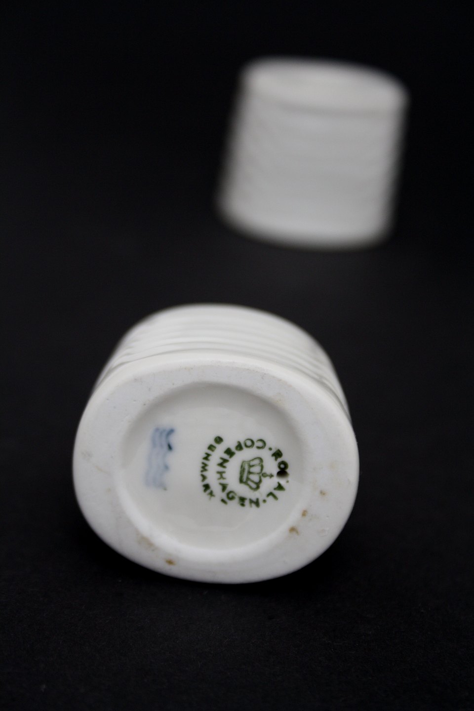 Text available in Danish: Royal Copenhagen, små kuvertlysestager eller julestager designet af Eva Stæhr Nielsen. Højde 3,5 cm. Længde 4 cm. I. sortering. Pris: 900 kr. samlet for 6 stk.