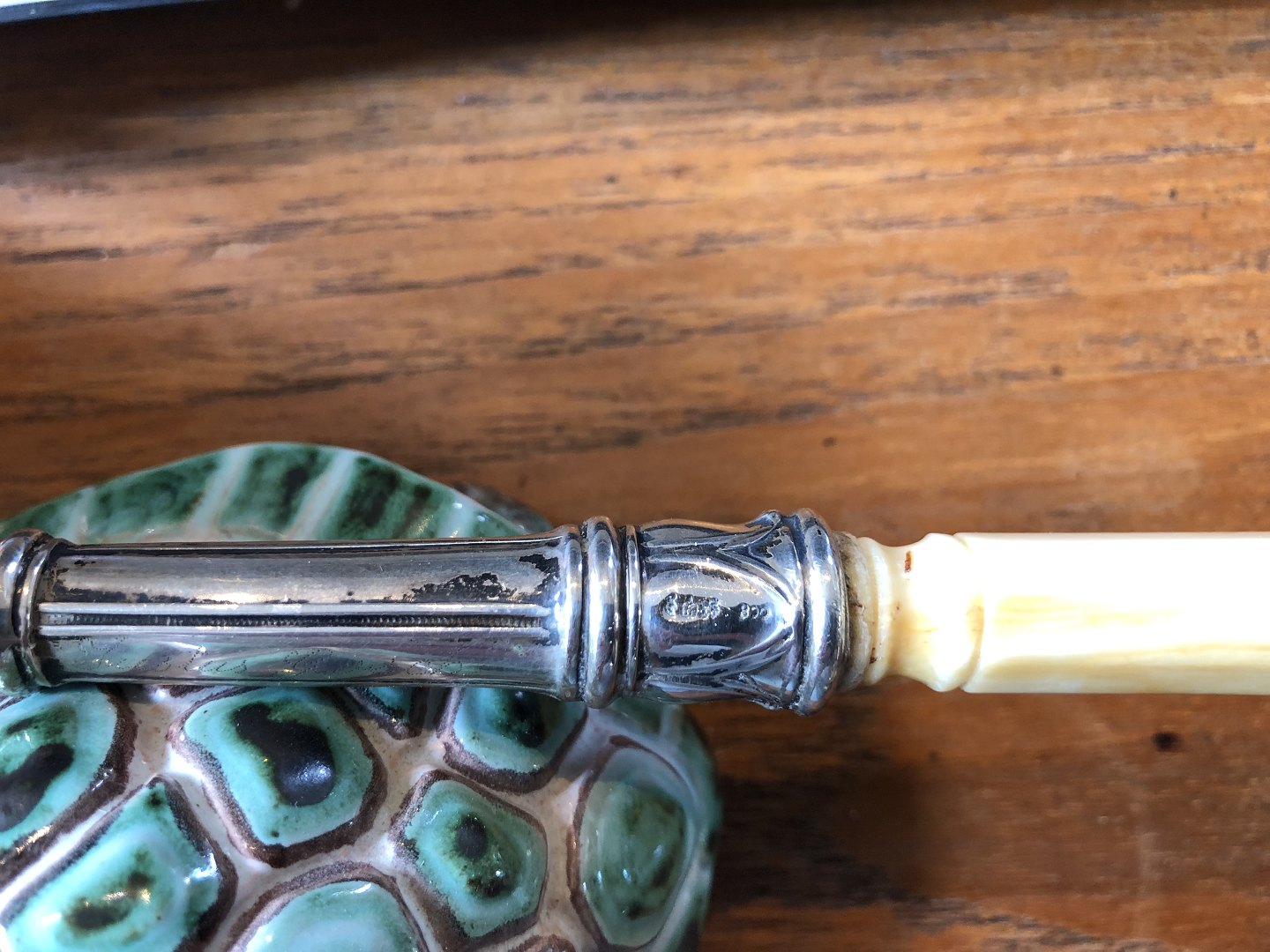 Punchske / Potageske i sølv med benskaft. Stemplet med Tyske sølvstempler og 800, Samt indgraveret: Justus Gosck D. 28 Mai 1897. 10,5 cm gezüchtet, 42 cm lang, Fremstår med nogle småbuler i bunden*