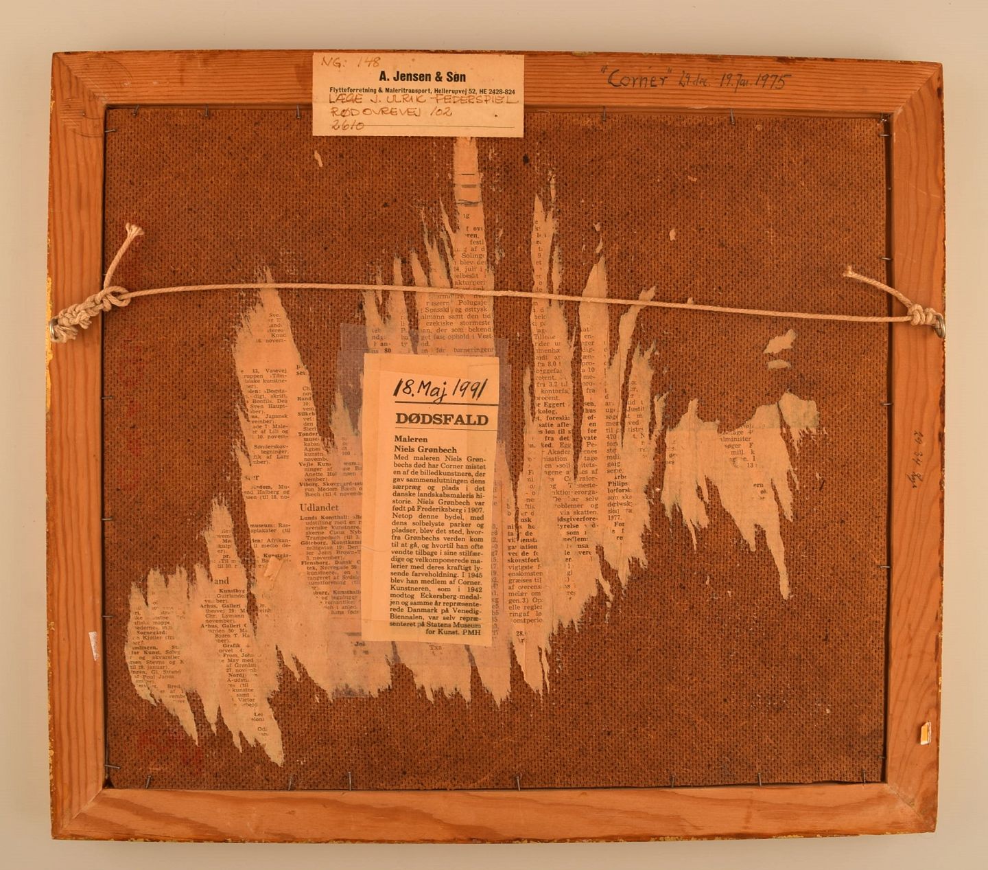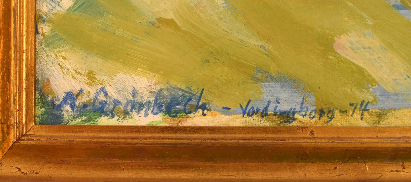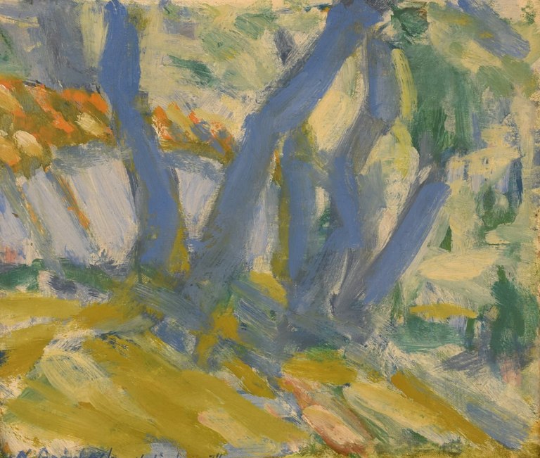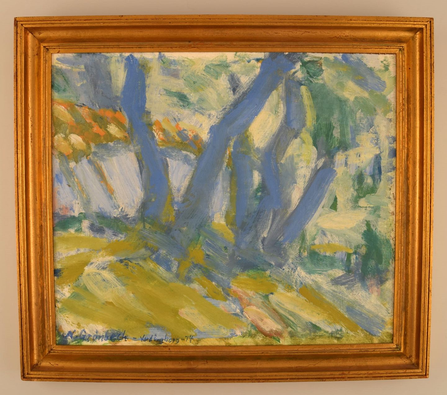 Niels Grønbech (1907-1991), dansk maler. Olie på plade. Modernistisk landskab. Vordingborg. Dateret 1974.