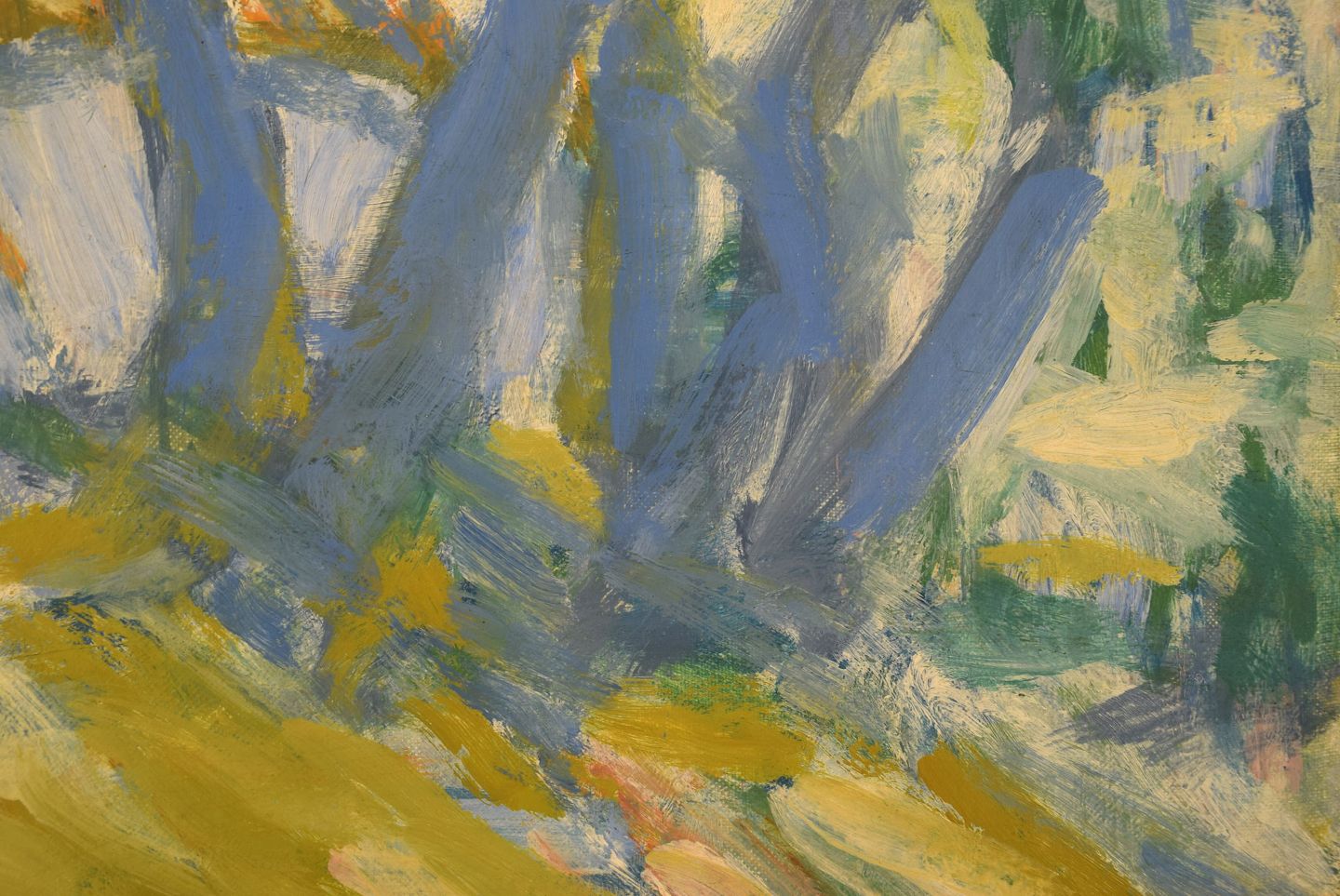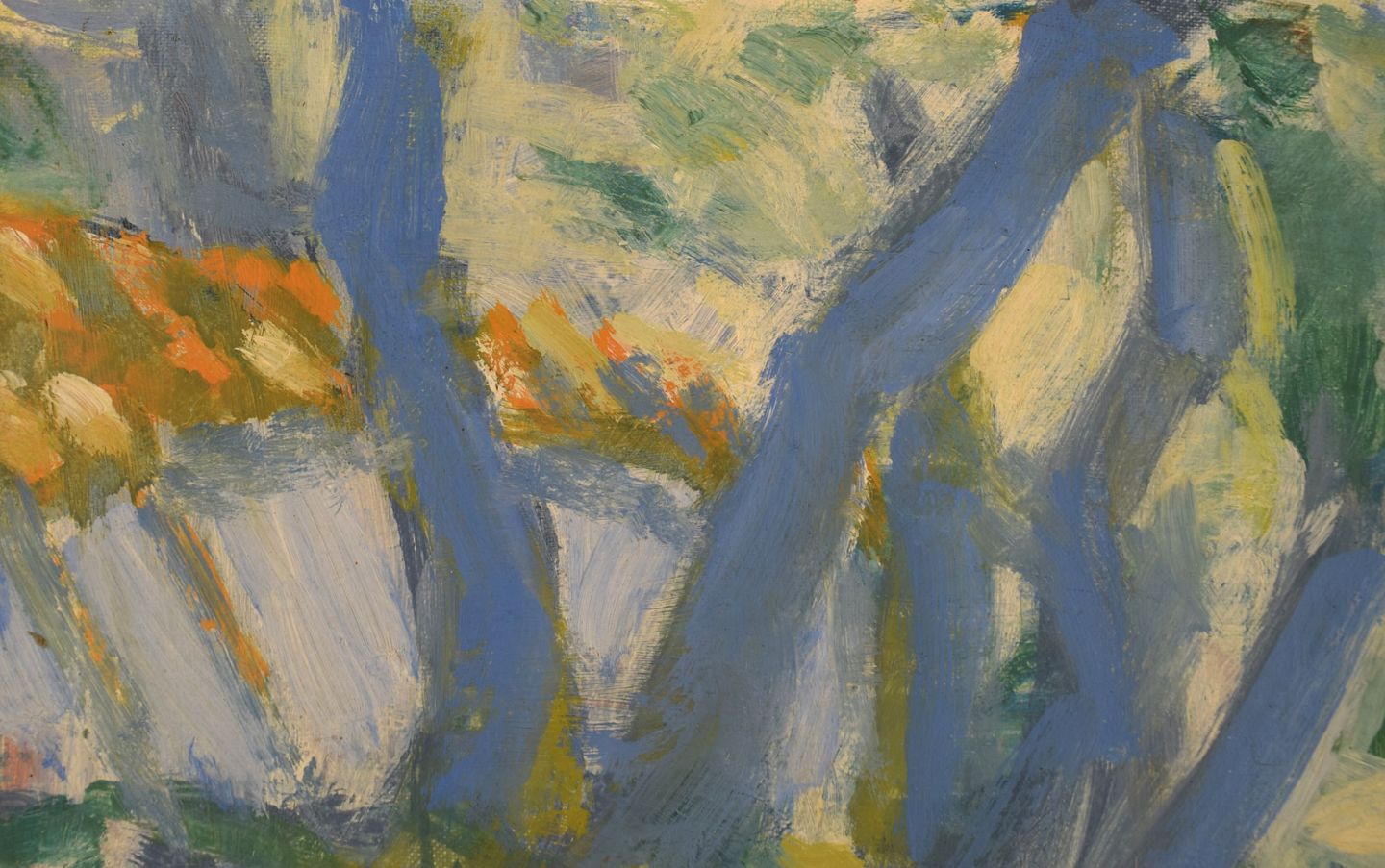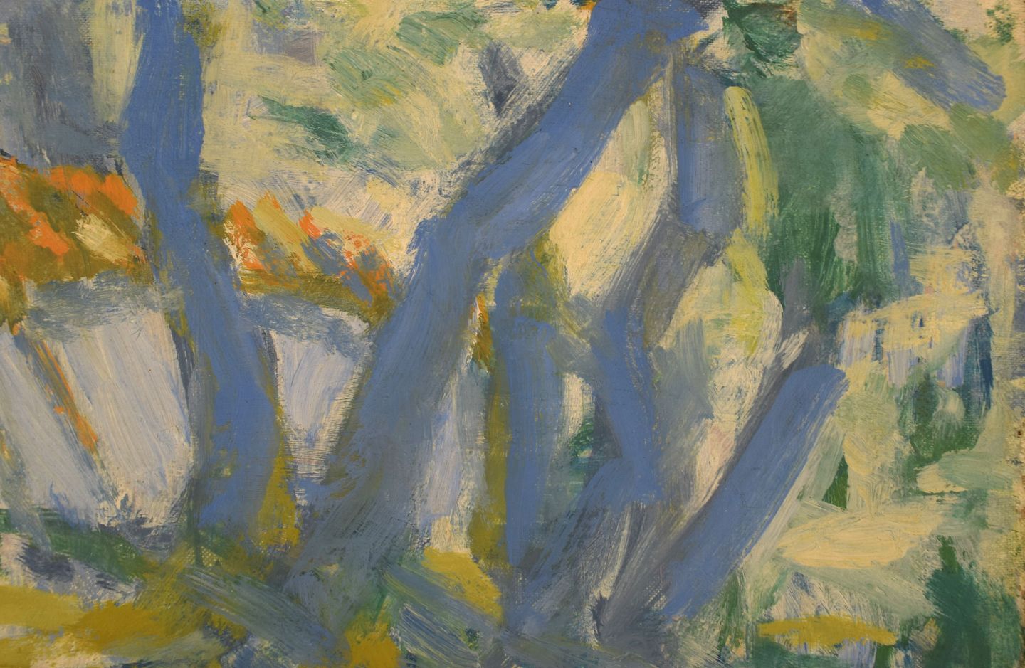Niels Grønbech (1907-1991), dansk maler. Olie på plade. Modernistisk landskab. Vordingborg. Dateret 1974.
