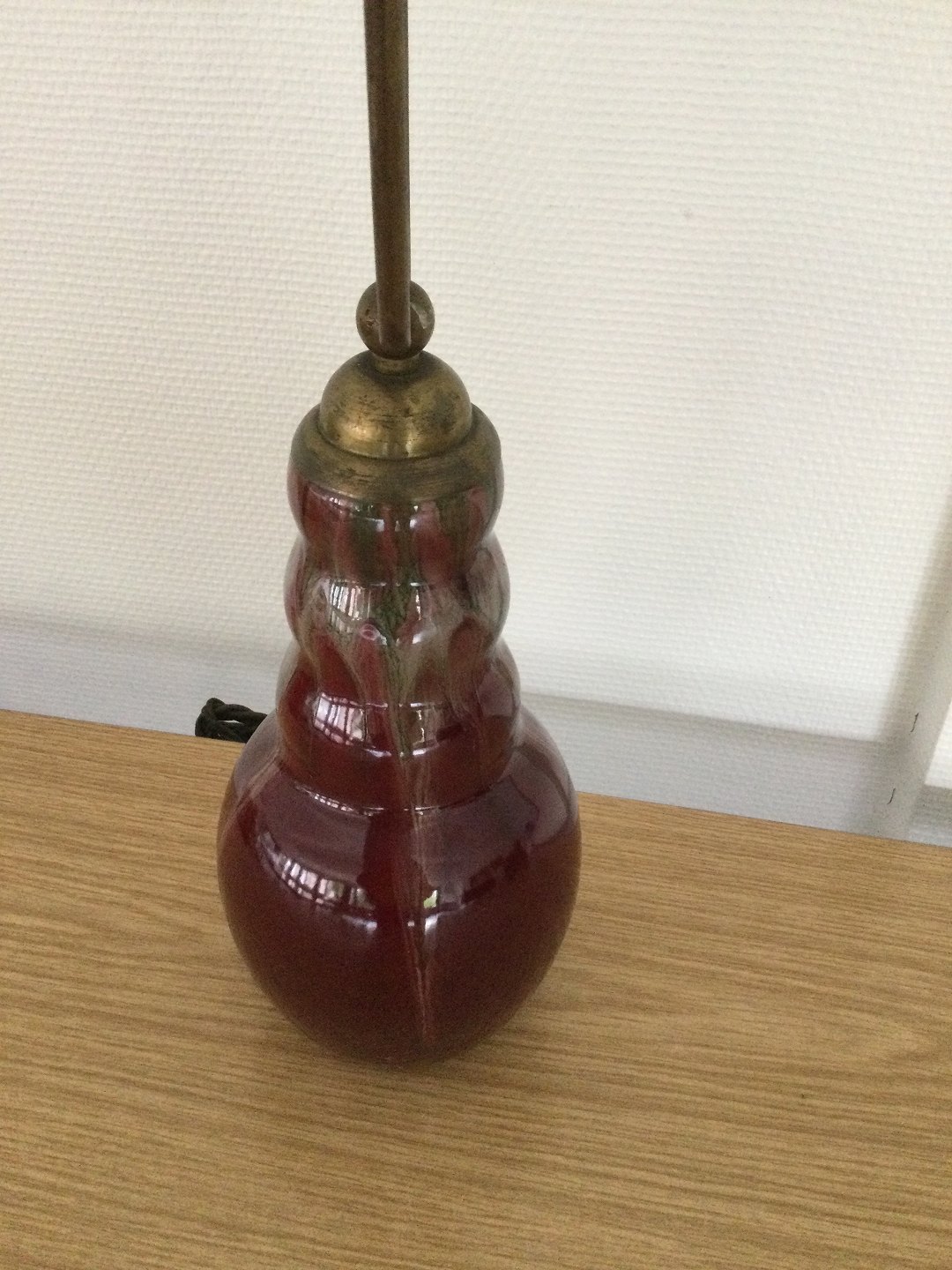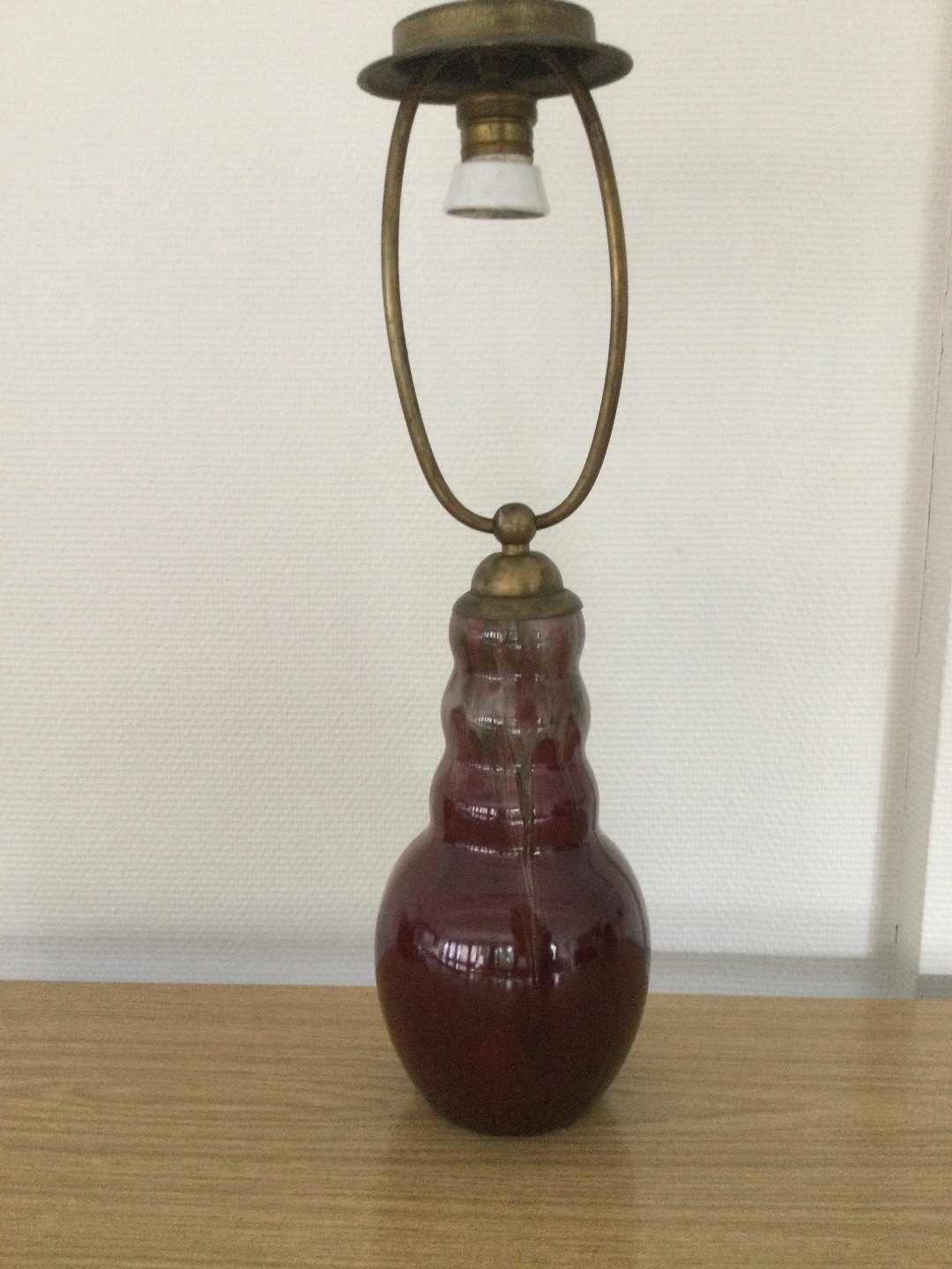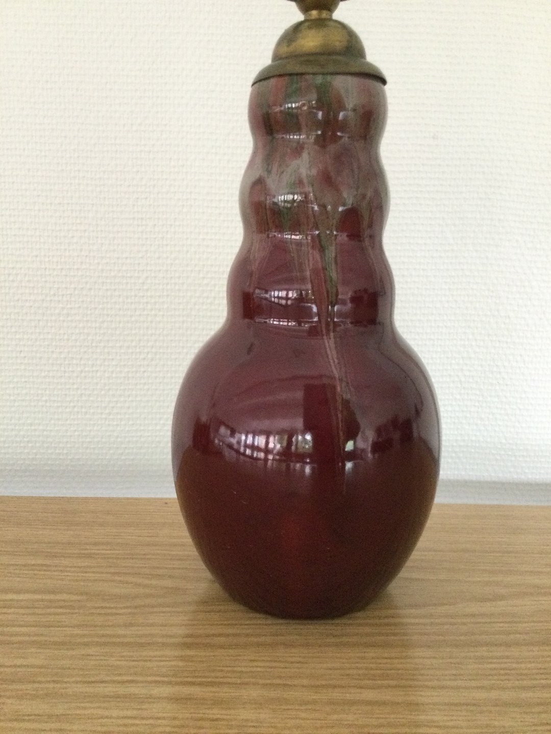 Bordlampe med okseblodsfarvet og grålig flyde glasur.