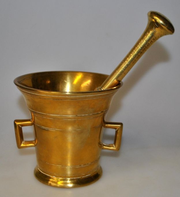 Dansk messing morter med to hanke og pistil, 19. årh. Højde.: 10,5 cm. Længde pistil: 20 cm.