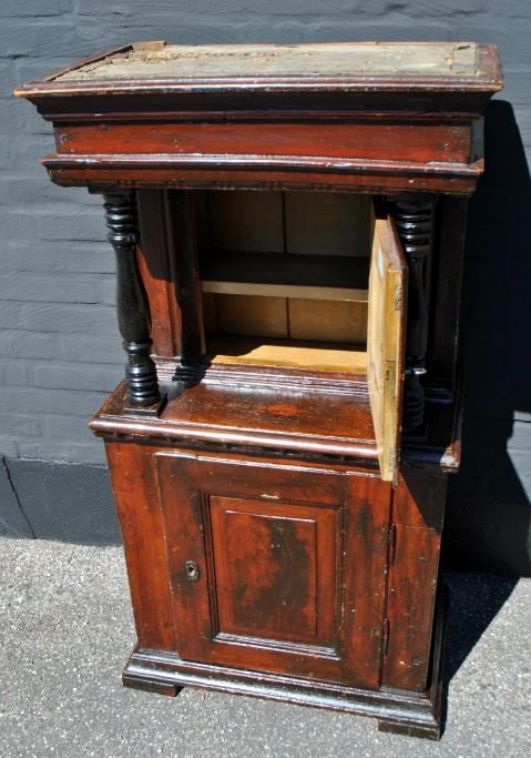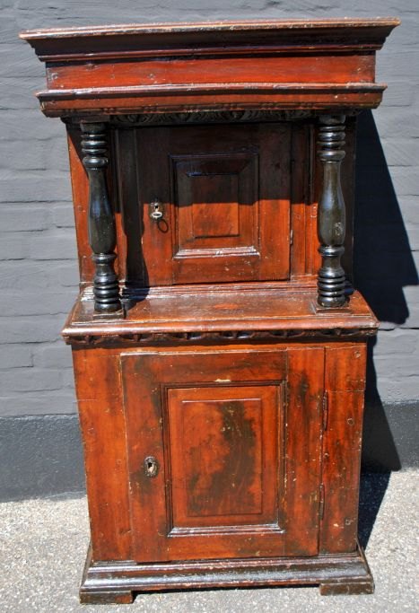 Dansk barokt stolpeskab, 18./19. årh. Brunmalet fyrretræ. Oprindelig rød/blå malet. Med to søjler. Skab for oven med en hylde og hemmeligt rum. Skab forneden med hylde. Indvendig gulmalet. H.: 120 cm. B.: 65 cm. D.: 36 cm.