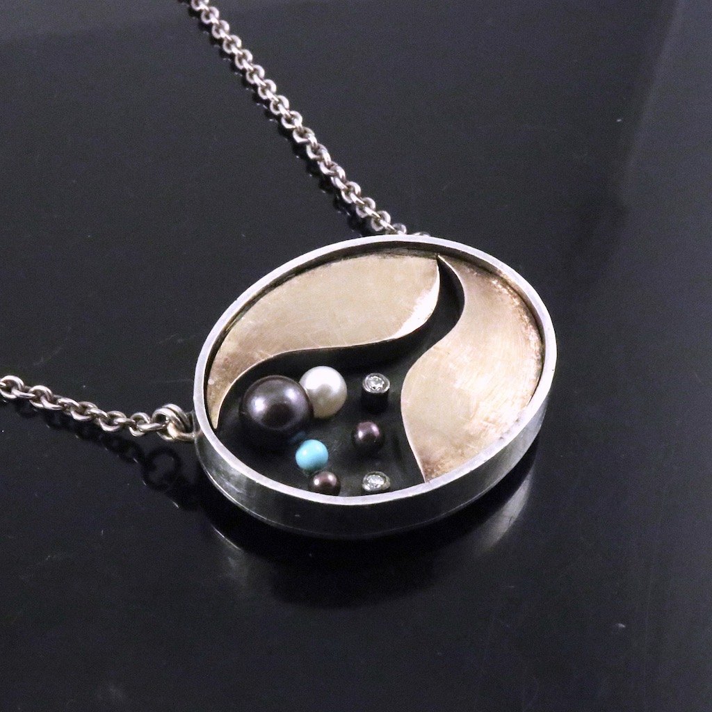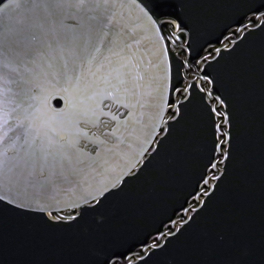 Ole Waldemar Jacobsen. Vedhæng i sterling sølv med 18k guld, turkis og brillanter.
