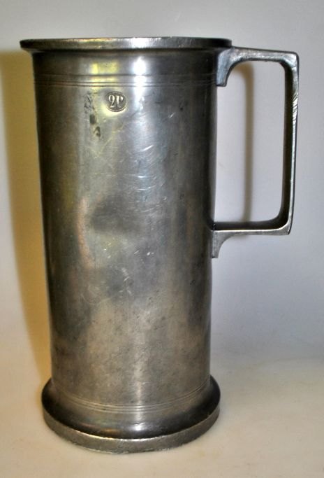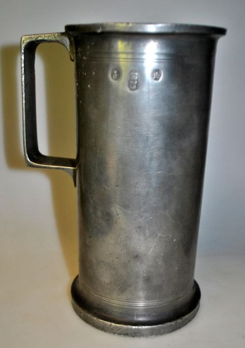 Målebæger i tin, København 1844, Danmark. 2 pot = 1 kande. Udformet i 1844 af ubekendt mester D.W.D. I 1879 er bægeret stemplet efter lov. Yderligere stempler på rand og kant. H.: 23,5 cm. Dia.:12,3 cm.