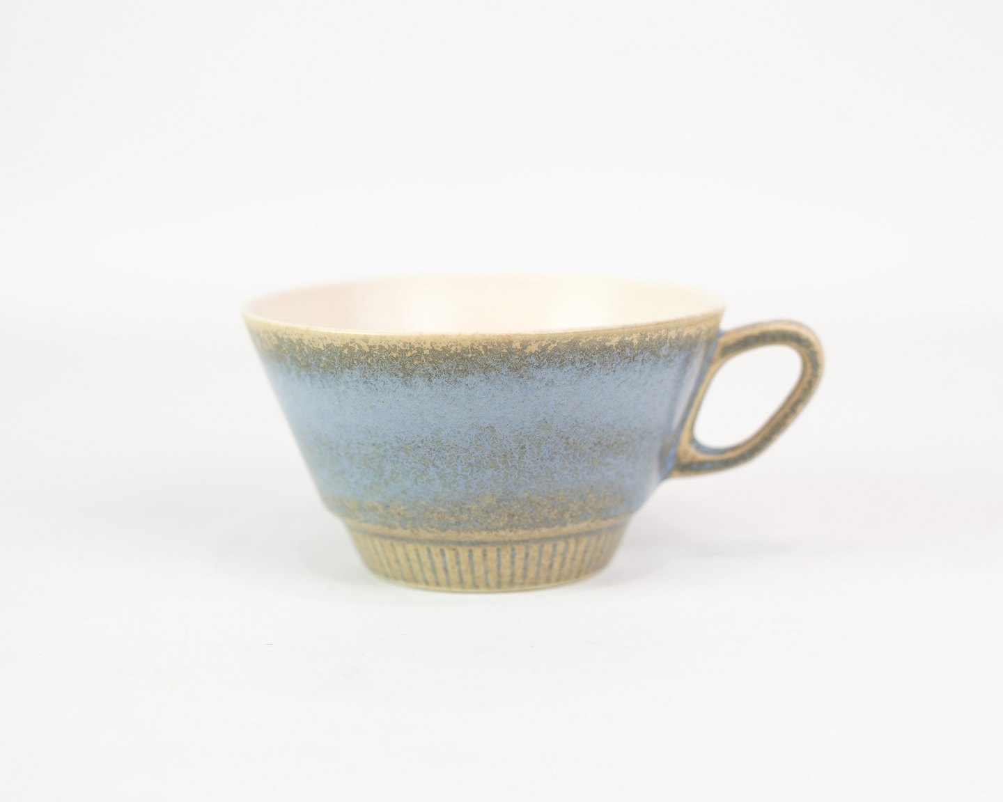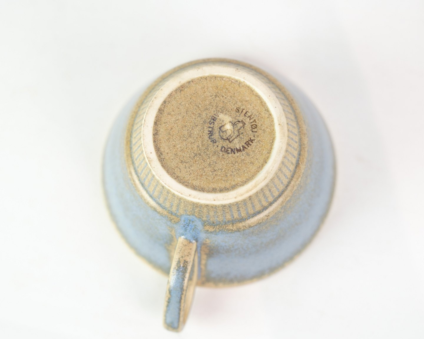 Kaffekopper med underkop i stentøj af Nødebo i blå farver fra omkring 1970'erne.