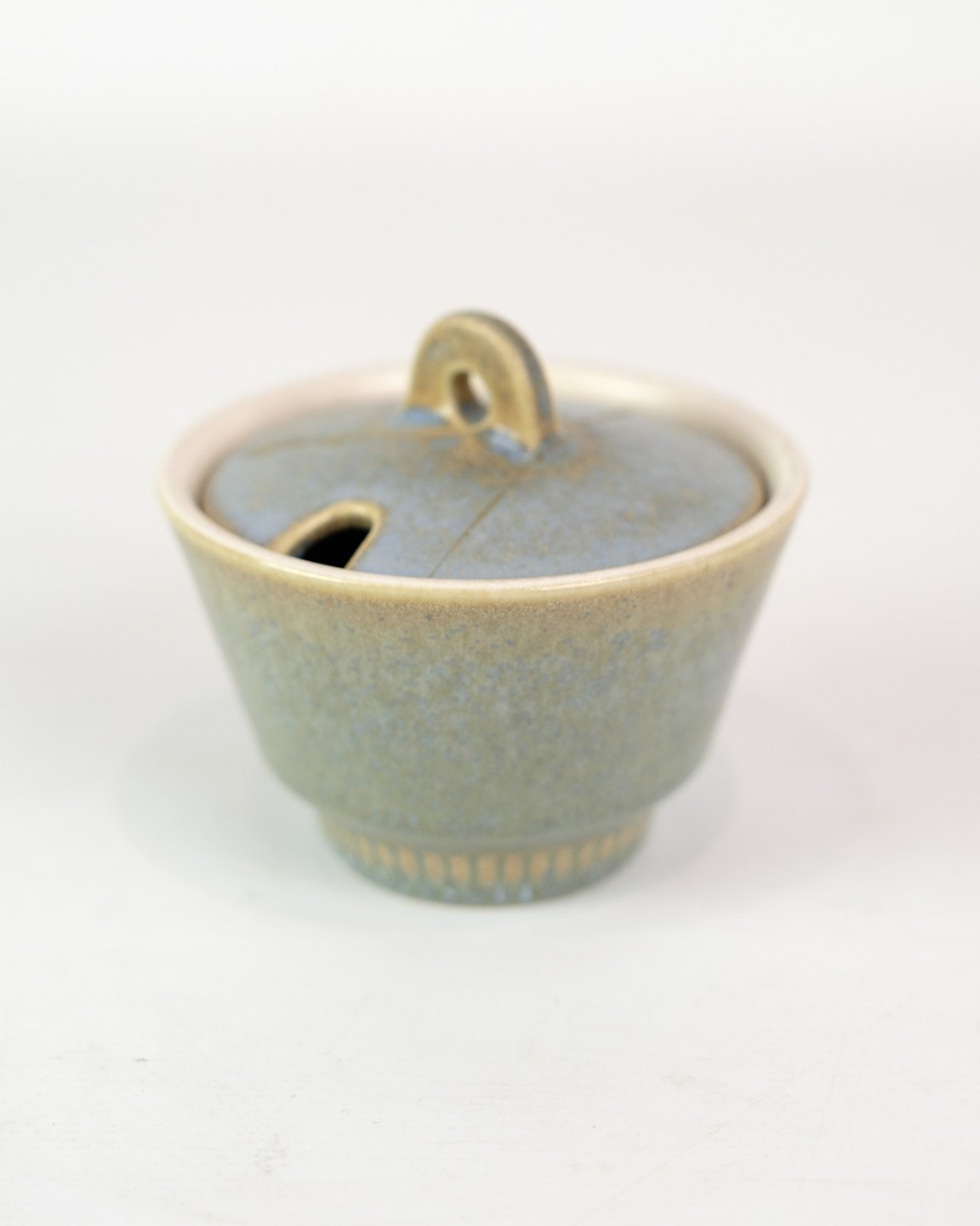 Knabstrup sukkerskål i stentøj af Nødebo i blå farver fra omkring 1970'erne