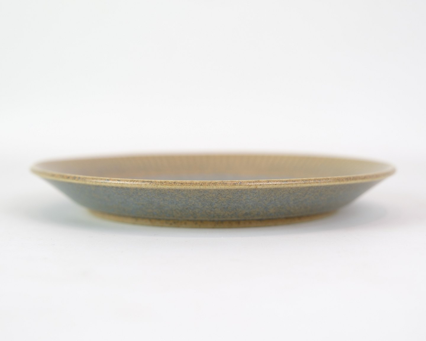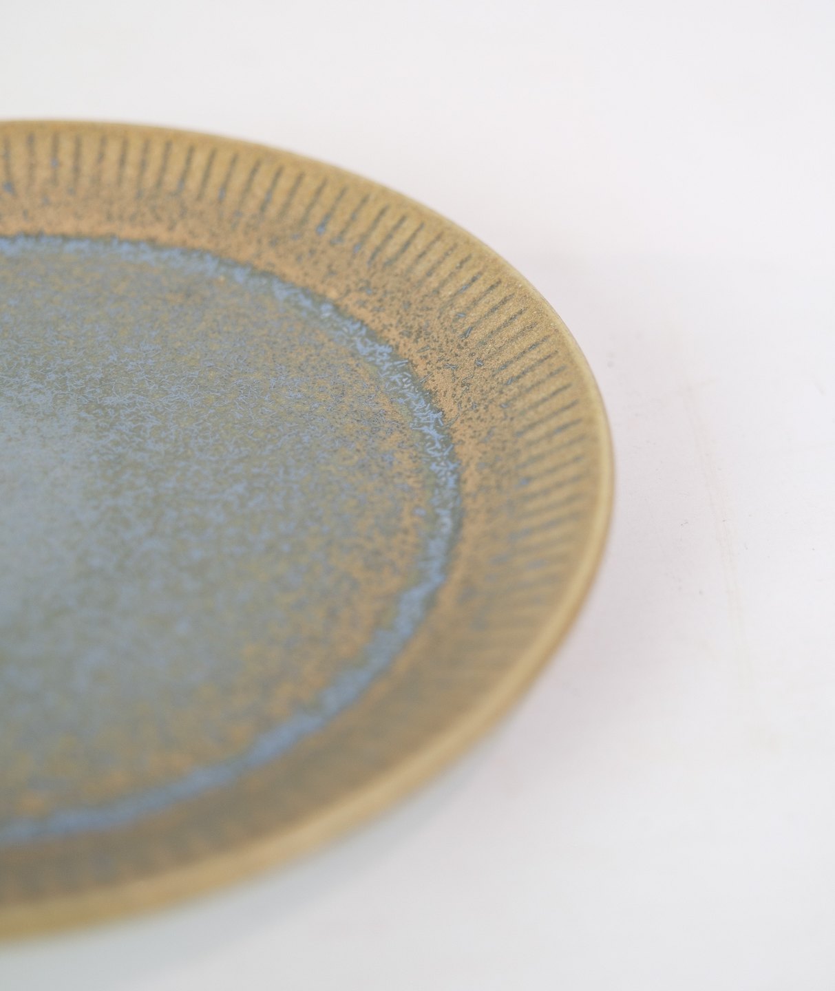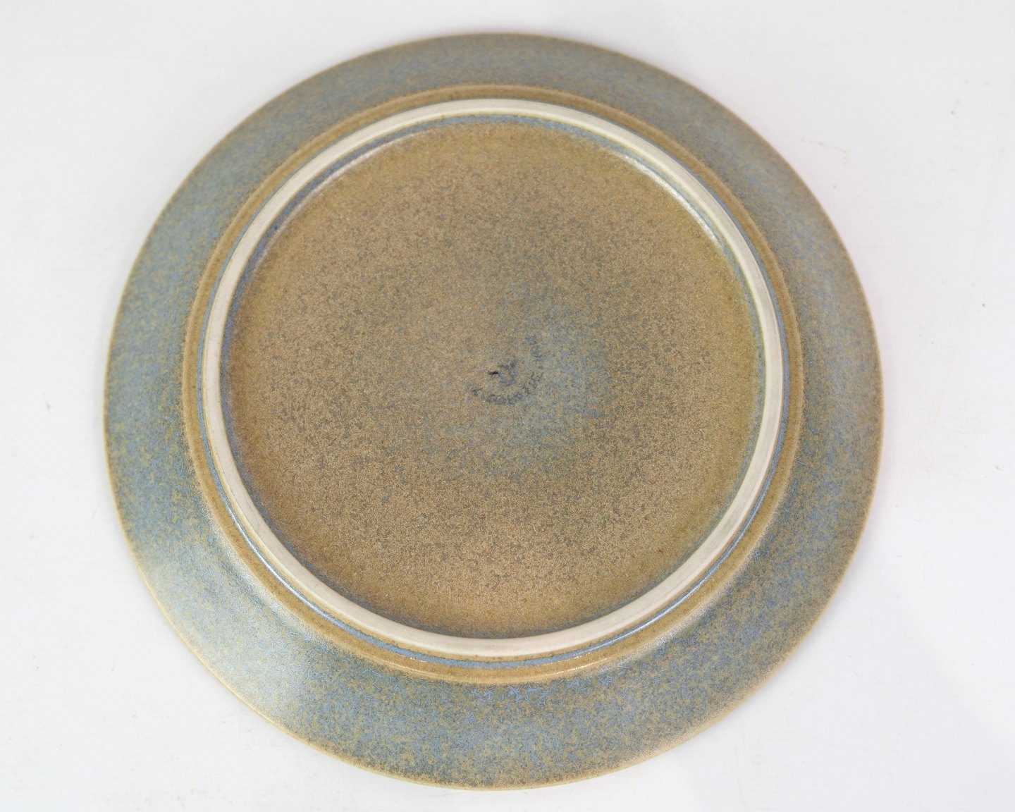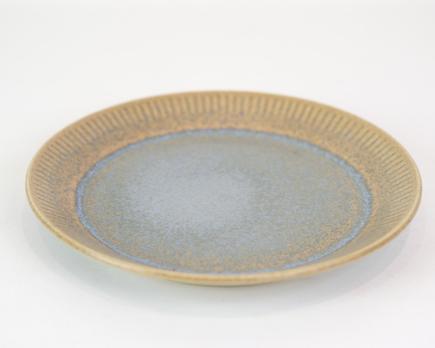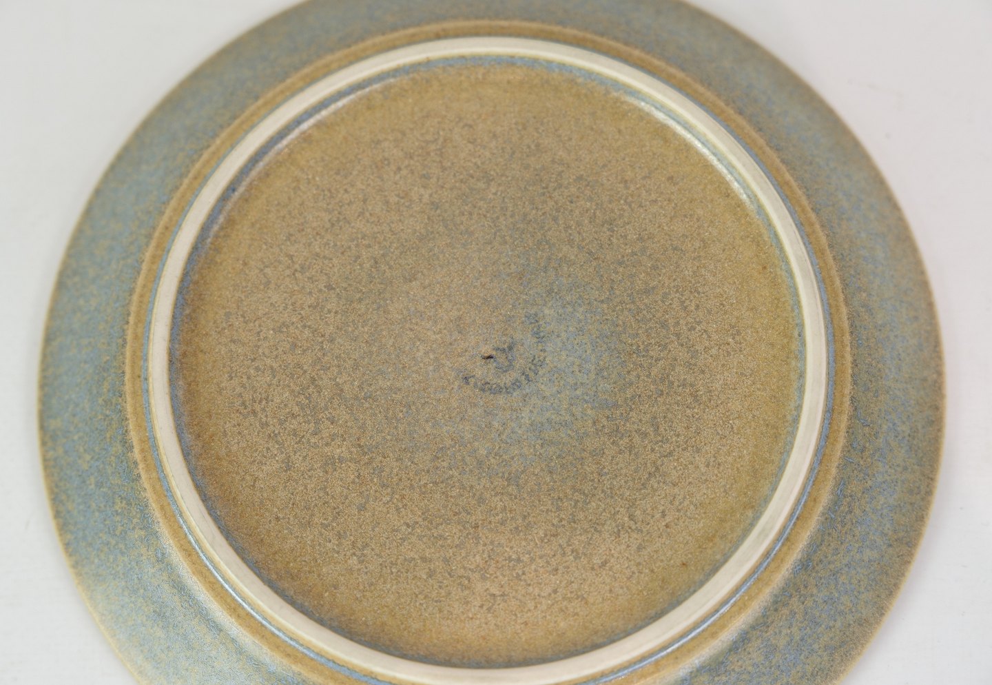Kagetallerkener af Nødebo Knabstrup stentøj i blå farver fra 1970'erne.