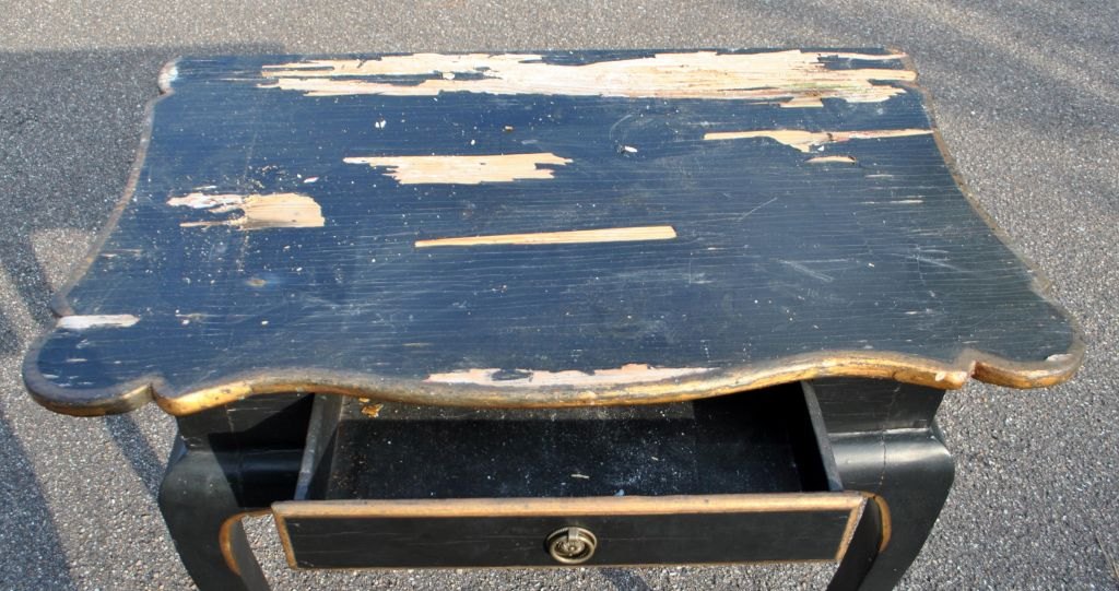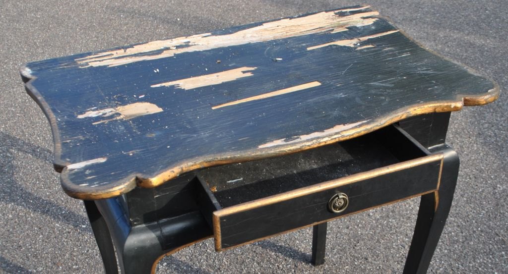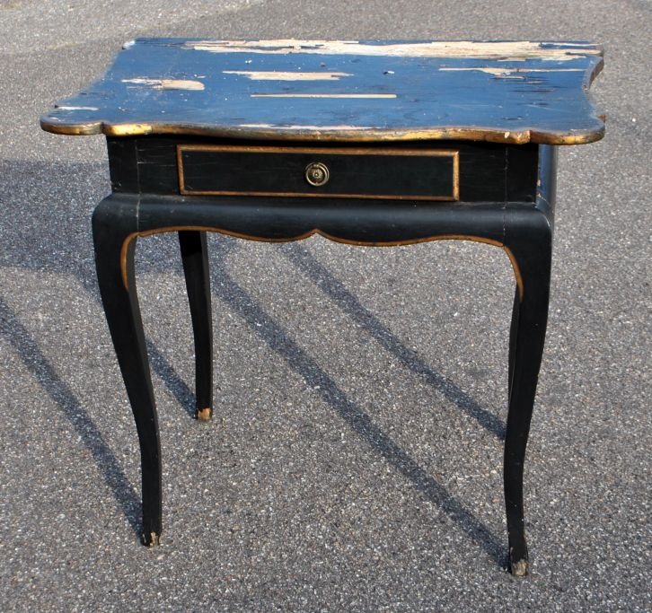 Danish black-painted baroque shaped table, 20th century. With capriole legs and drawer. Part of the plate is cut off in depth. Height: 79 cm. D.: 545 cm. L. 87 cm.