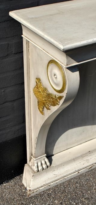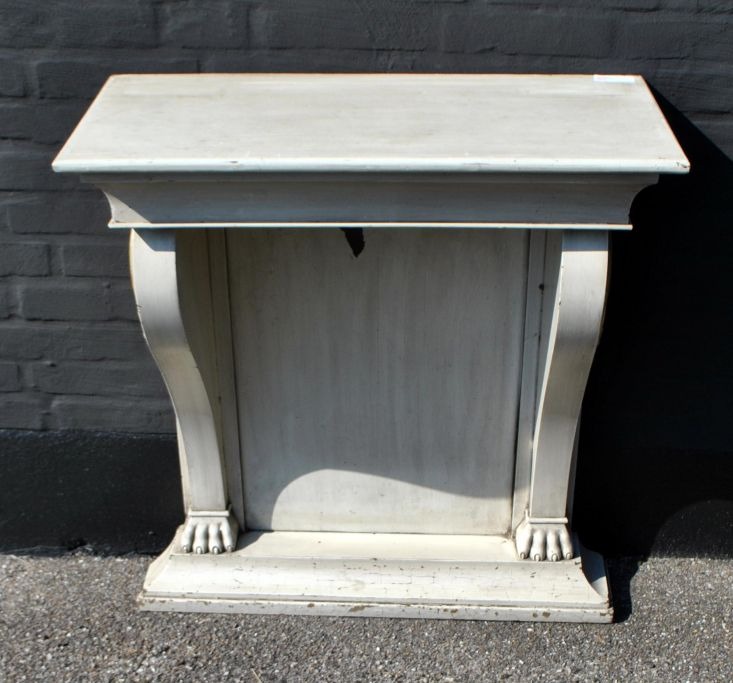 Bemalet konsol fra Kyholm ved Samsø, ca. 1830 - 1840. Med løvefødder og forgyldninger på siderne. H: 85 cm. B.: 74 cm. D.: 35 cm.