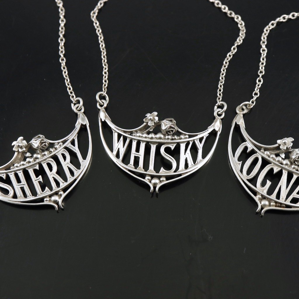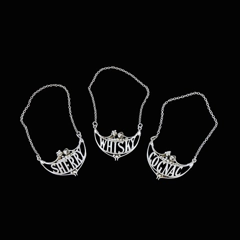 Tre flaskeskilte i sterlingsølv. - Sherry, Whisky & Cognac.