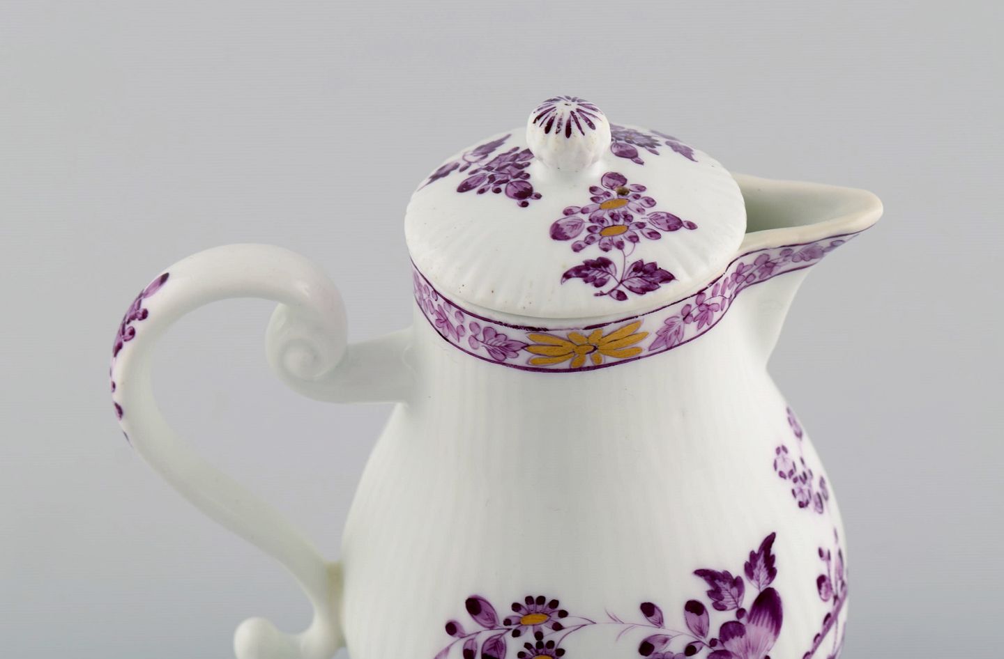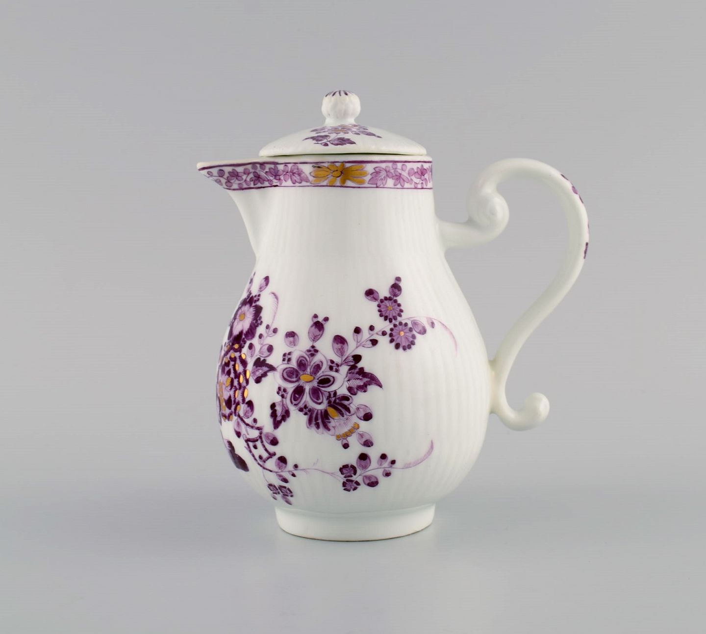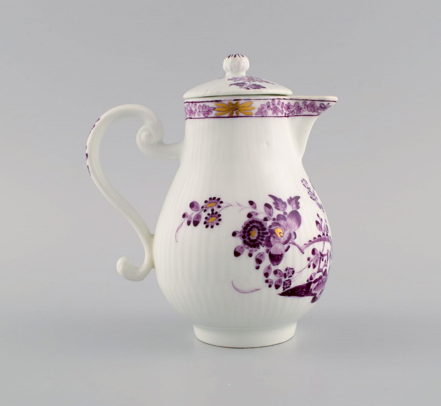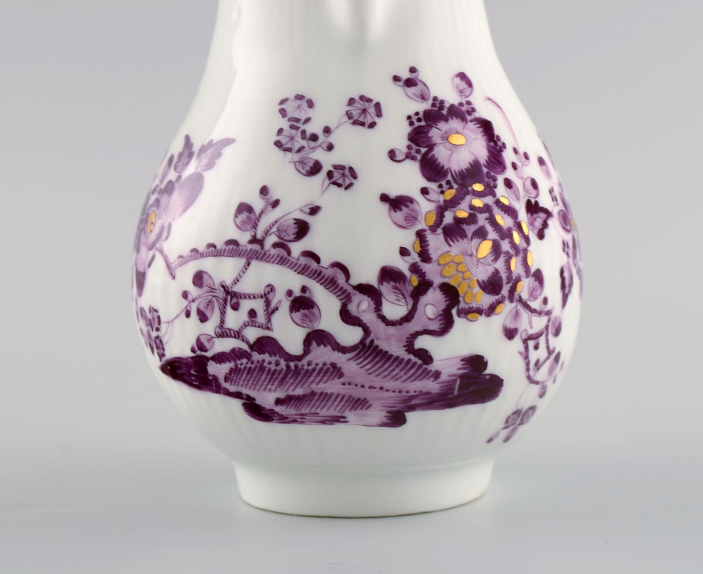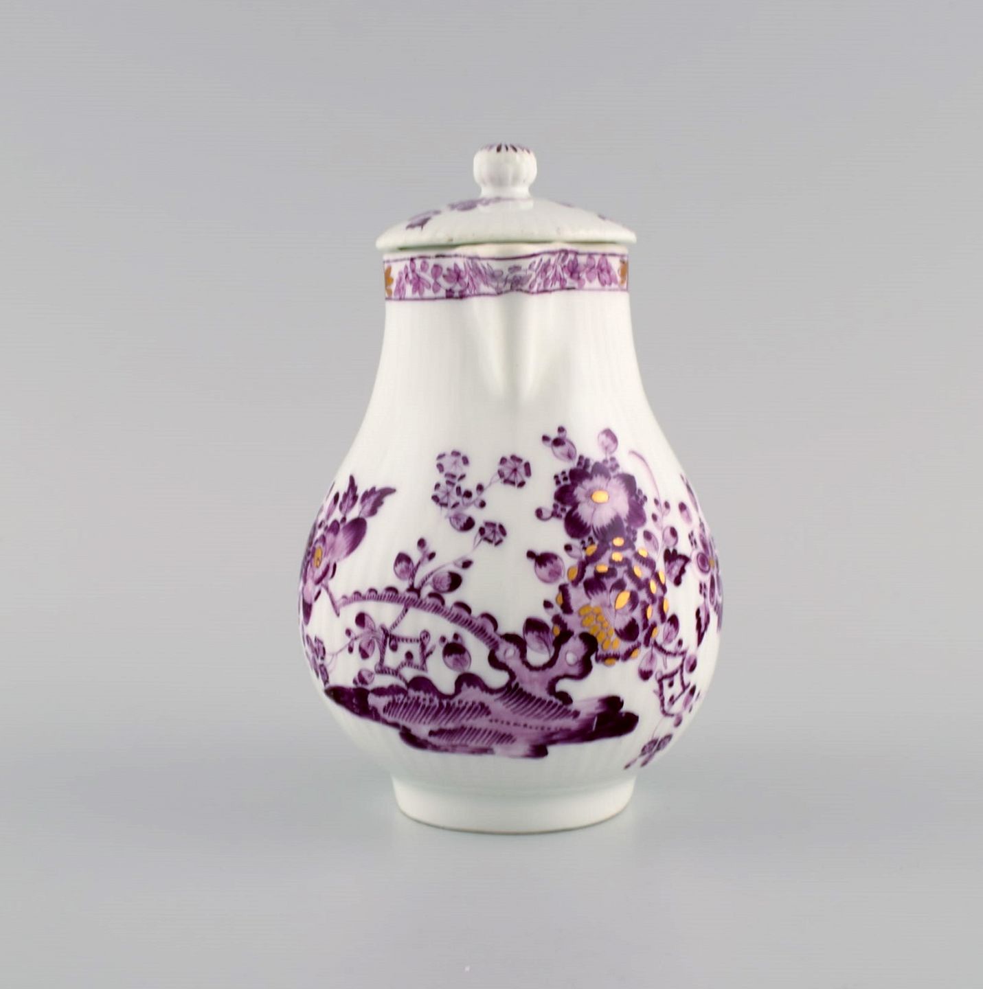 Antik og sjælden Meissen mokkakande i håndmalet porcelæn. Purpur blomster og guldekoration. Tidligt 1800-tallet.