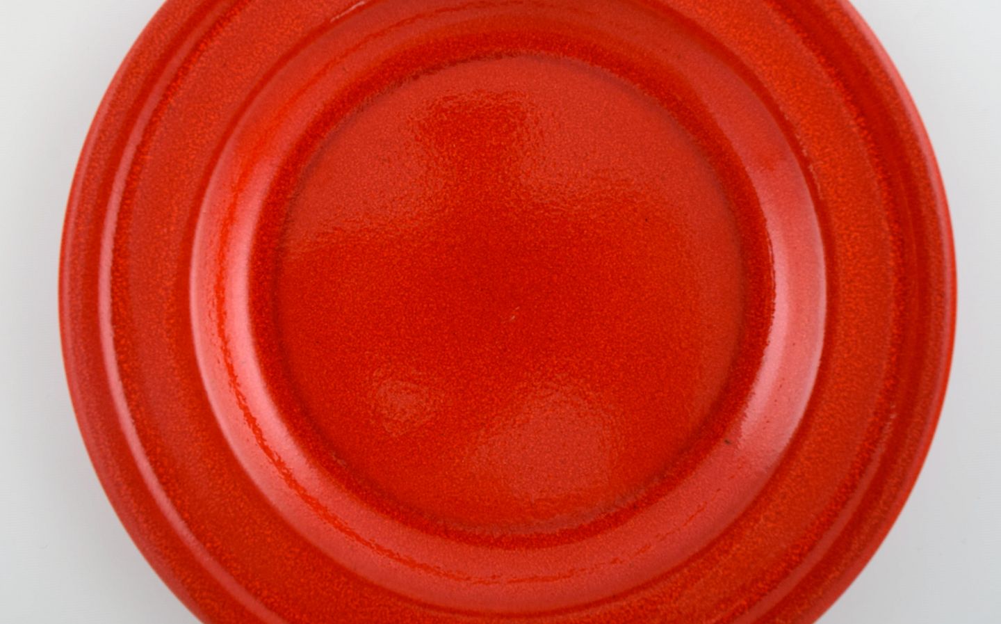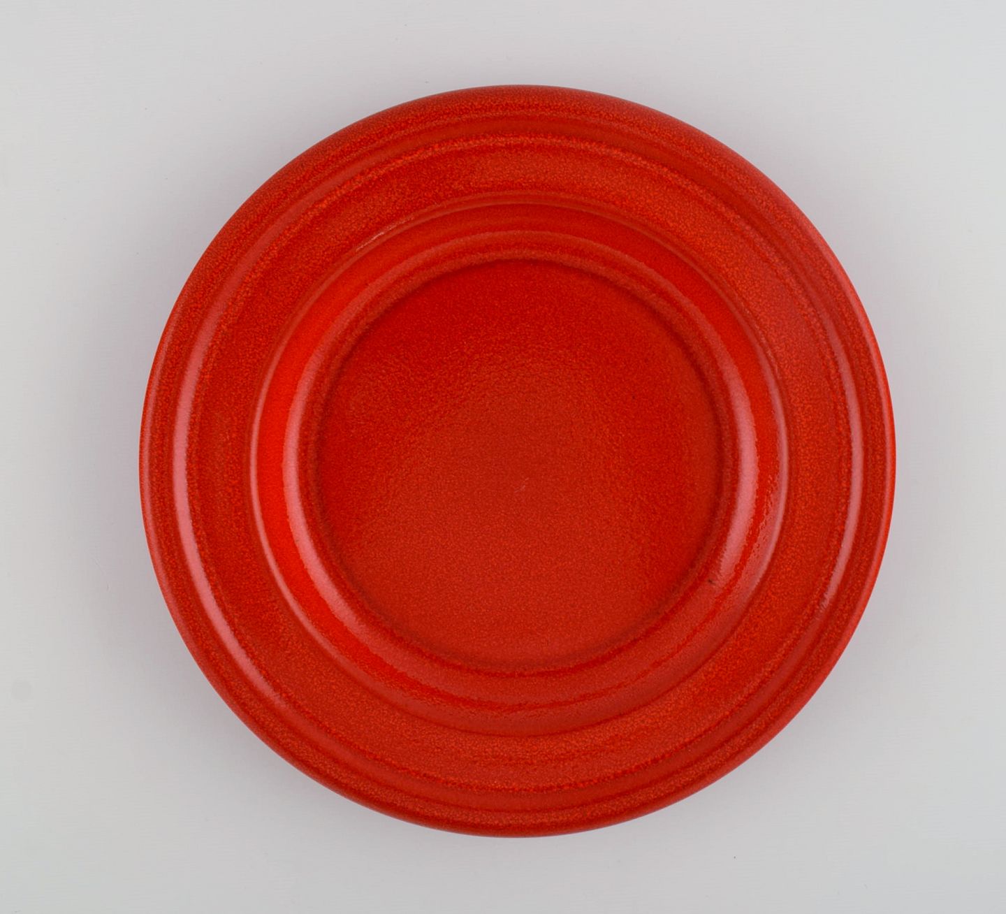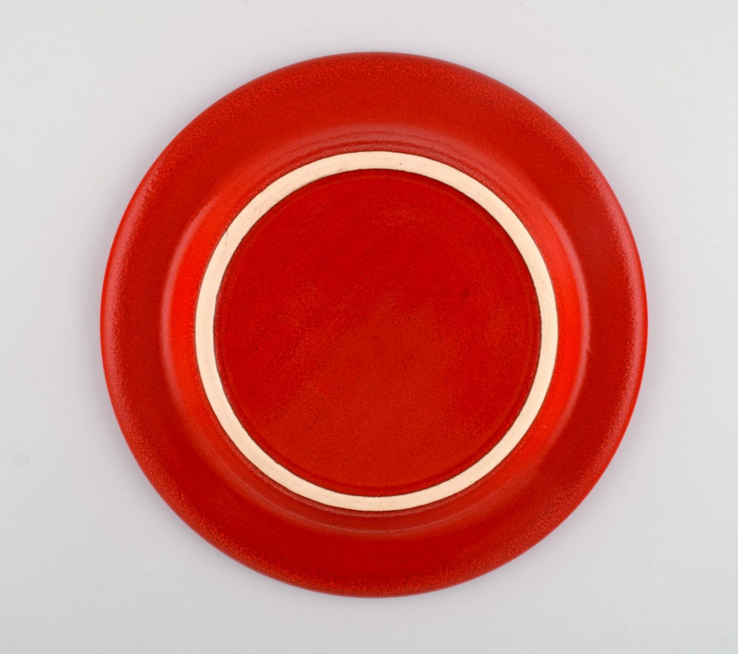 Emile Henry, Frankrig. Otte frokosttallerkener i glaseret stentøj. Smuk glasur i røde nuancer. Midt 1900-tallet.