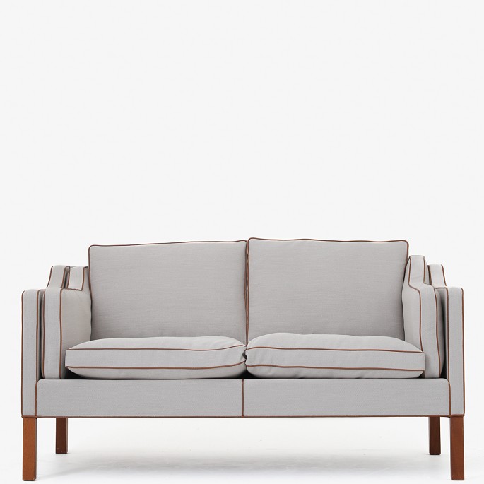 BM 2212 - Nybetrukket 2 pers. sofa i nyt tekstil - Steelcut Trio (farve 203) med keder i Elegance Walnut-læder og ben i mahogni. KLASSIK tilbyder polstring af sofaen med stof eller læder efter eget valg.