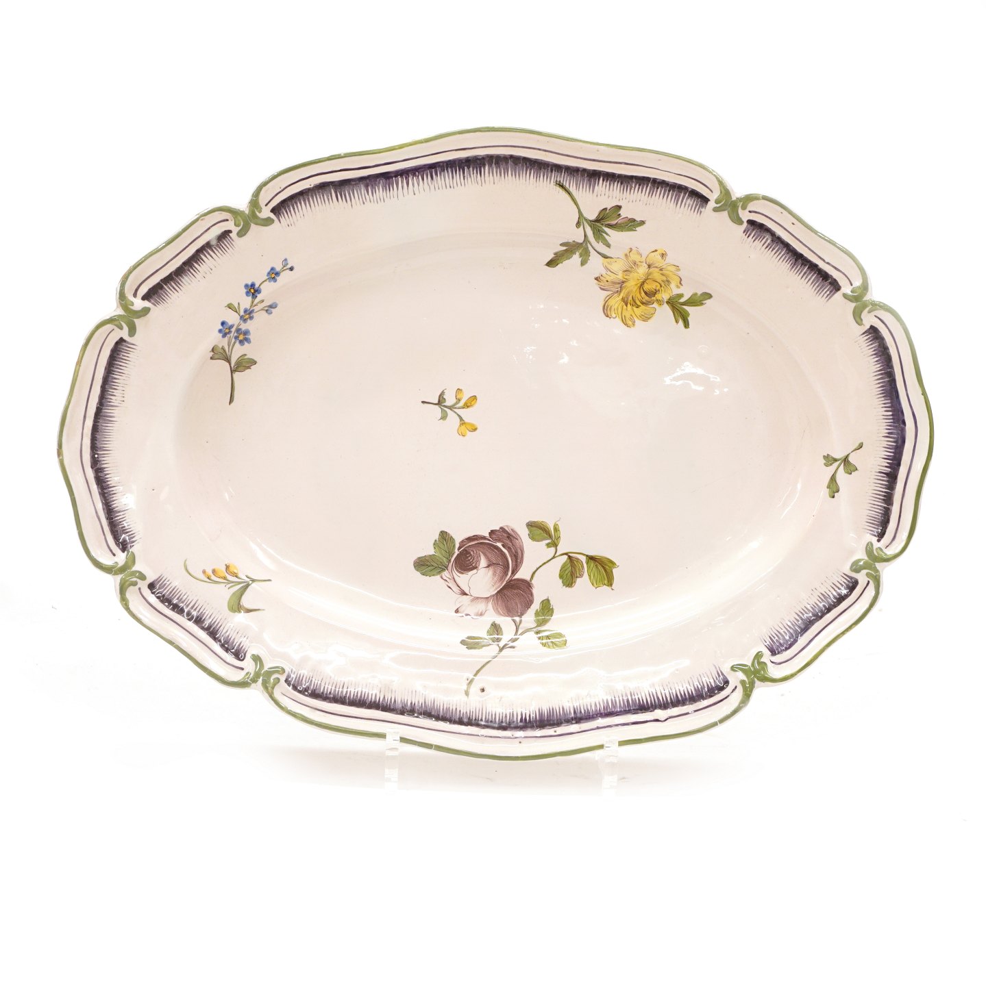 Polykrom dekoreret Stralsund terrin med underfad. Låggæk i form af citron. Fremstillet ca. år 1770. L fad: 41cm. H: 24cm