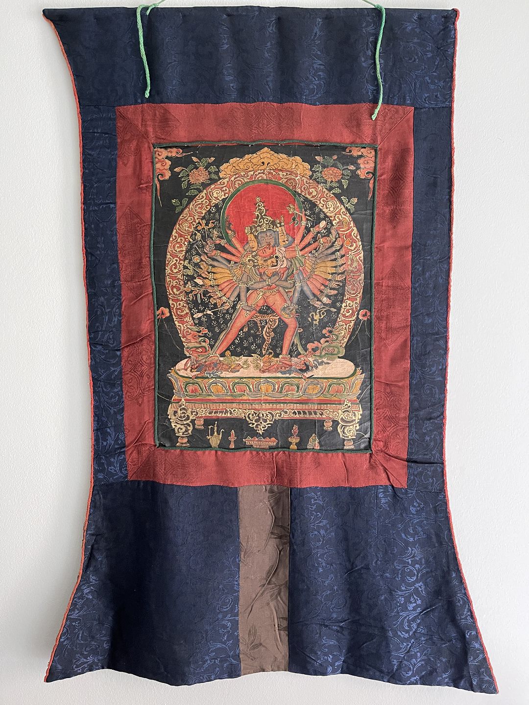 Shakti Thangka - asiatisk buddhistisk / hinduistisk Thangka-maleri monteret i håndsyret klæde, 20. århundrede