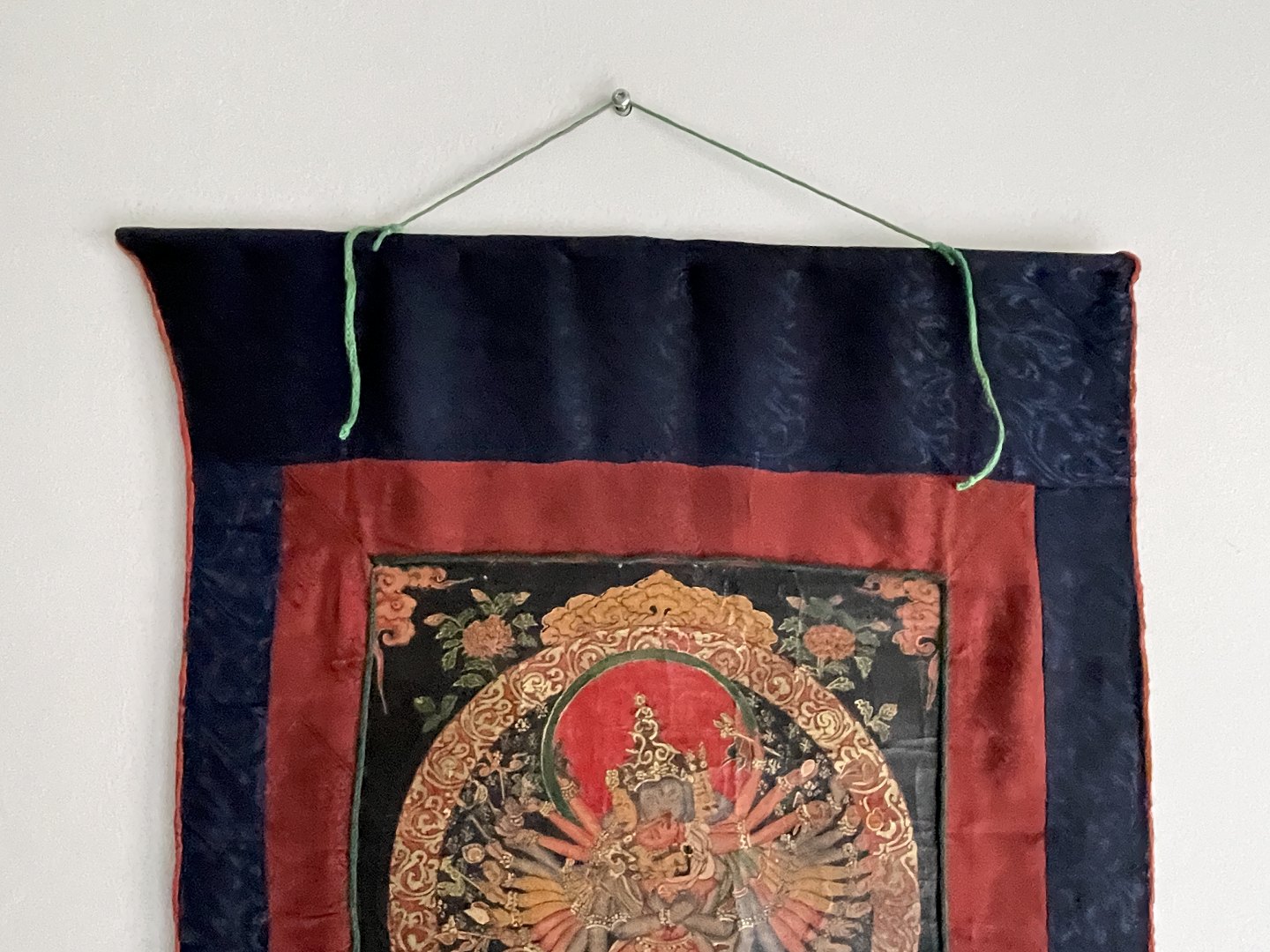 Asiatisk buddhistisk / Hinduistisk Thangka-maleri, monteret i håndsyet klæde af bomuld og silke, seneste halvdel af det 20. århundrede. Billedet forestiller Buddha og Shakti og symboliserer visdom.