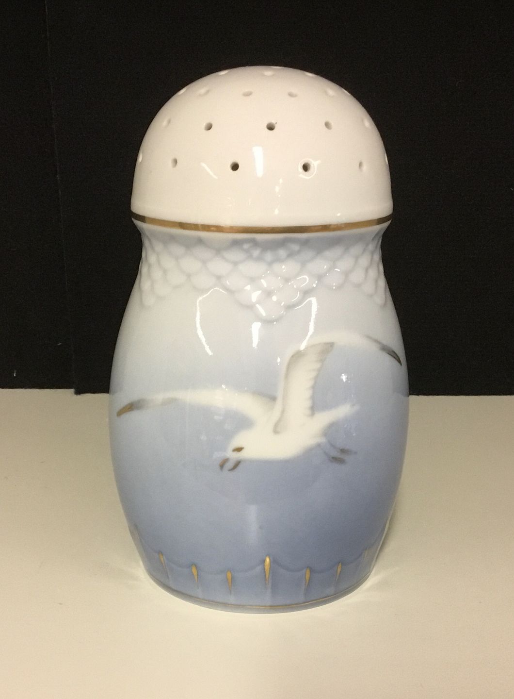 B & G Mågestel m. Guld, Meget sjælden sukkerstrødåse i perfekt stand. H 13,5 cm.