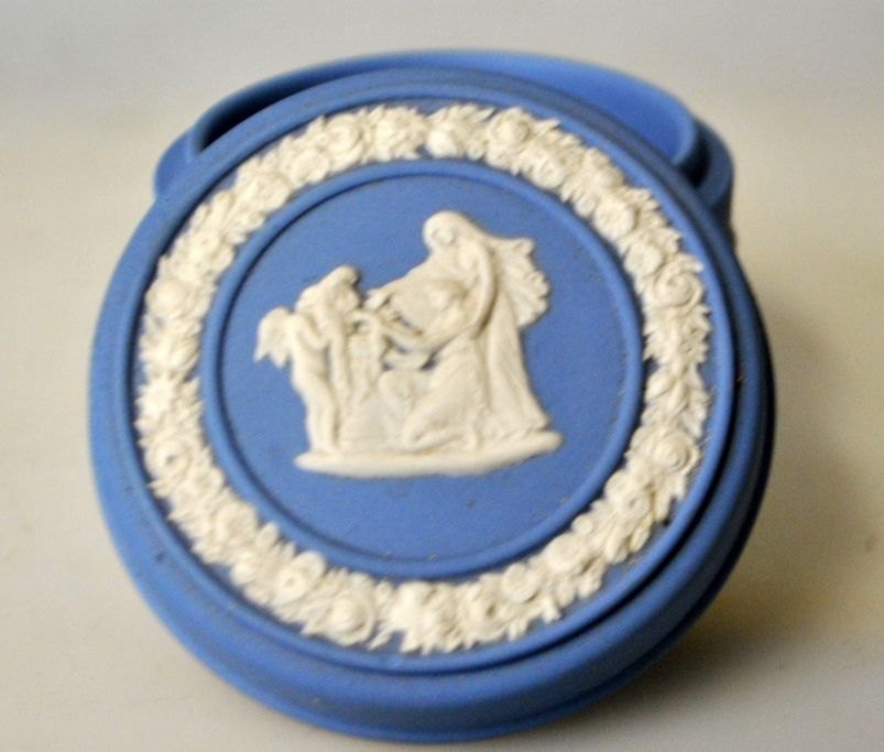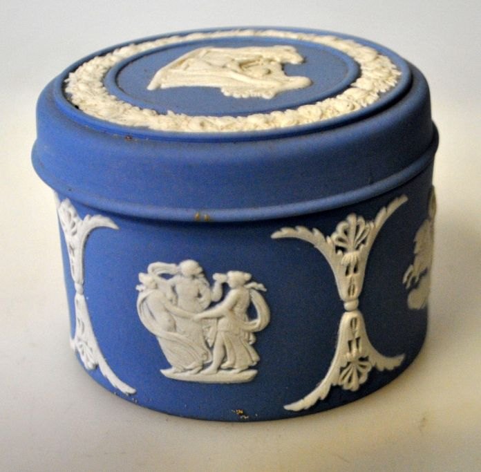 Weedgewood blue jasper bisquit porcelæns låg krukke, 20. årh. England. Dekoreret med klassiske kvinde figurer. Stemplet. H: 5 cm. Dia.: 6,5 cm.