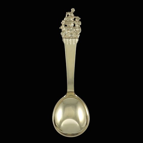 Rund barne/dessert-ske i forgyldt sølv med motiv fra H.C. Andersens eventyr.