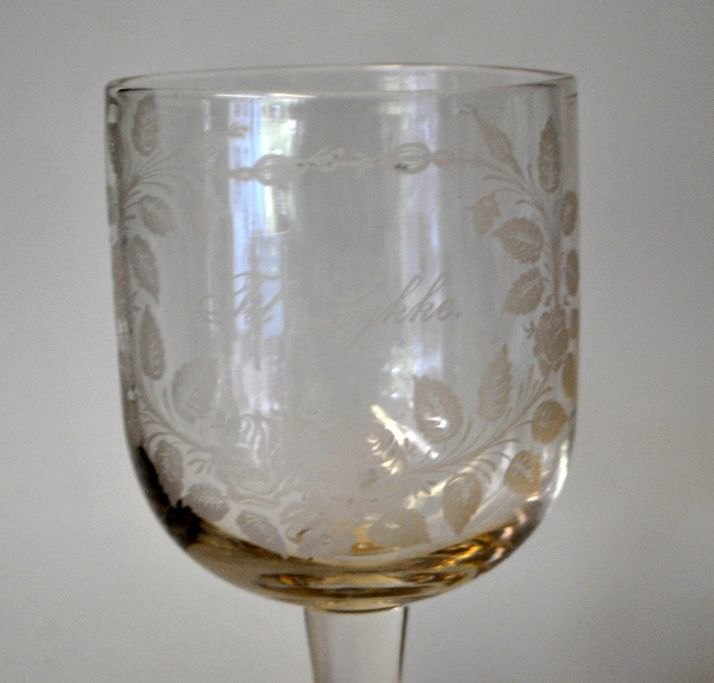 Erindringsglas, "Til lykke", Toddy glas eller ølglas. Afsprængt kumme på glat stilk. På kumme ætset blomsterkrans. I Kastrups katalog 1910. H: 16,5 cm.