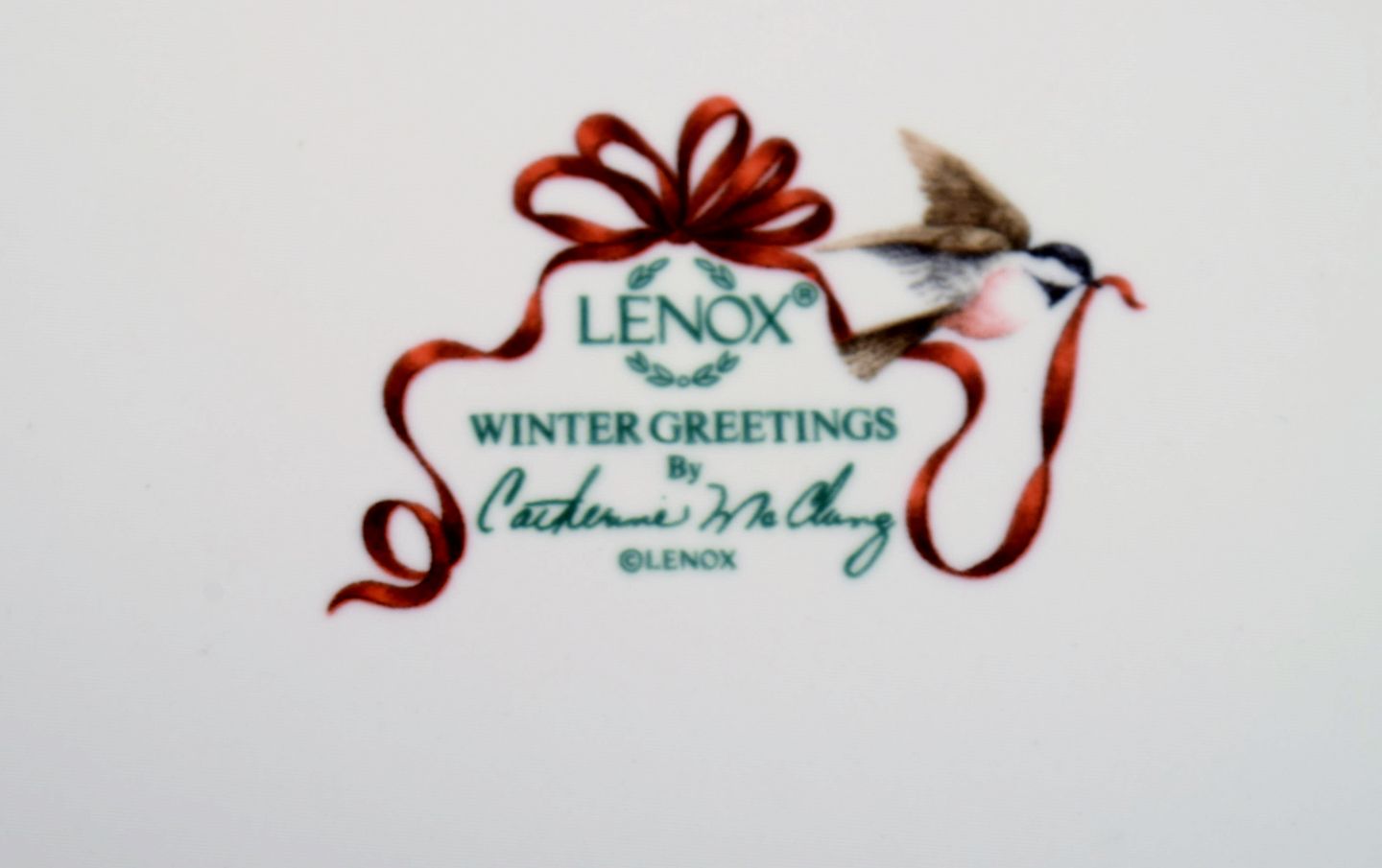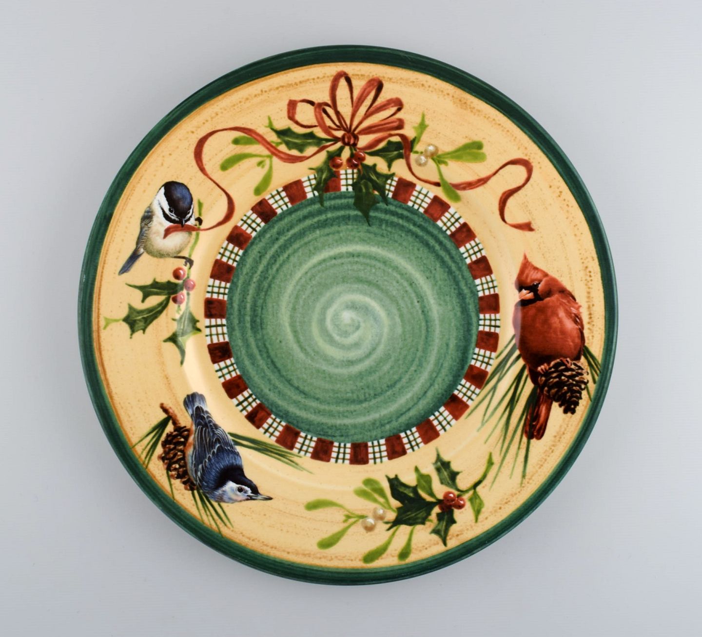 Catherine McClung for Lenox. "Winter greetings". Stort rundt fad i glaseret stentøj dekoreret med mistelten, fugle og rødt bånd. Ca. 2000.