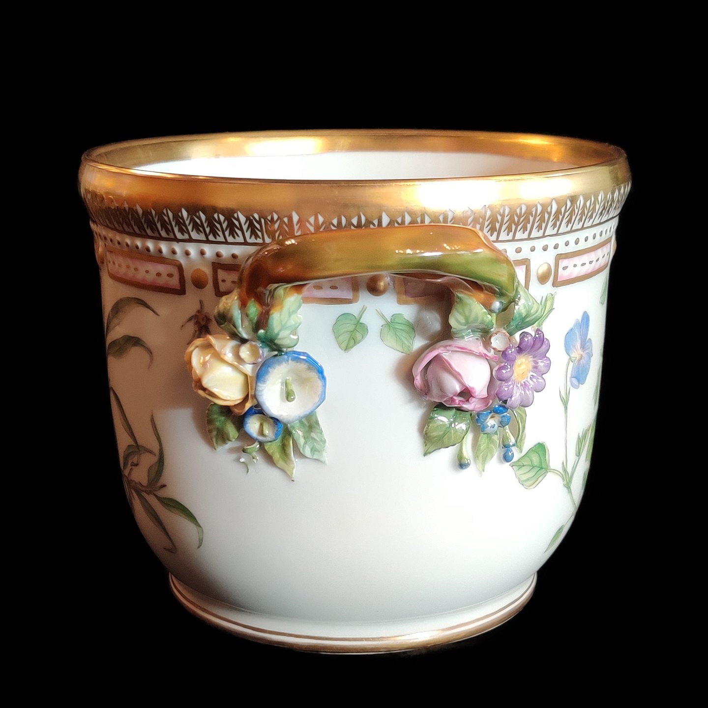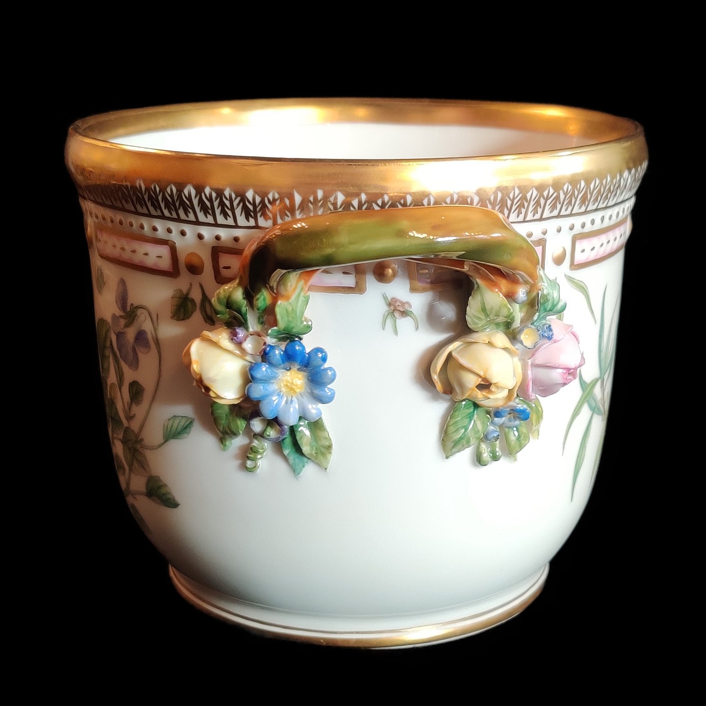 Dekoreret i farver og guld med blomster, hanke i form af snoede grene med pousserede blomster.