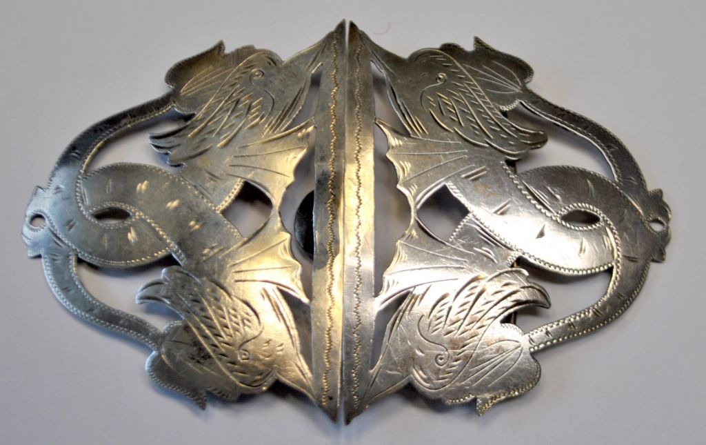 Silver belt with dolphin/fish decorations. approx. 1900. Stamped 826 and mastermarked AB. 6 x 9 cm.
