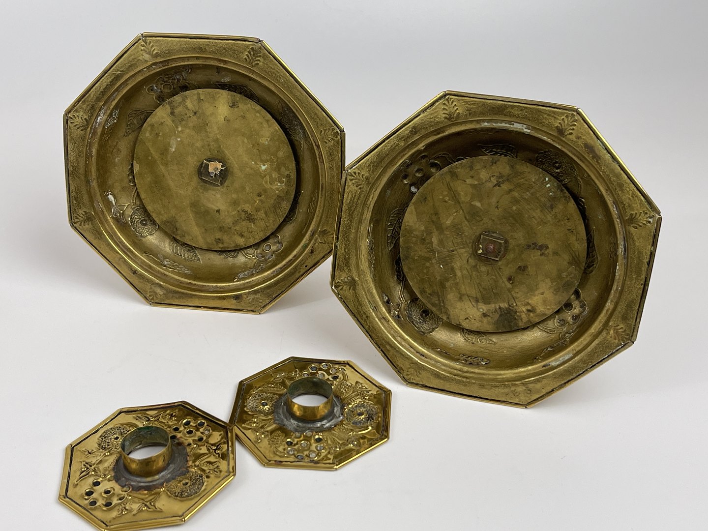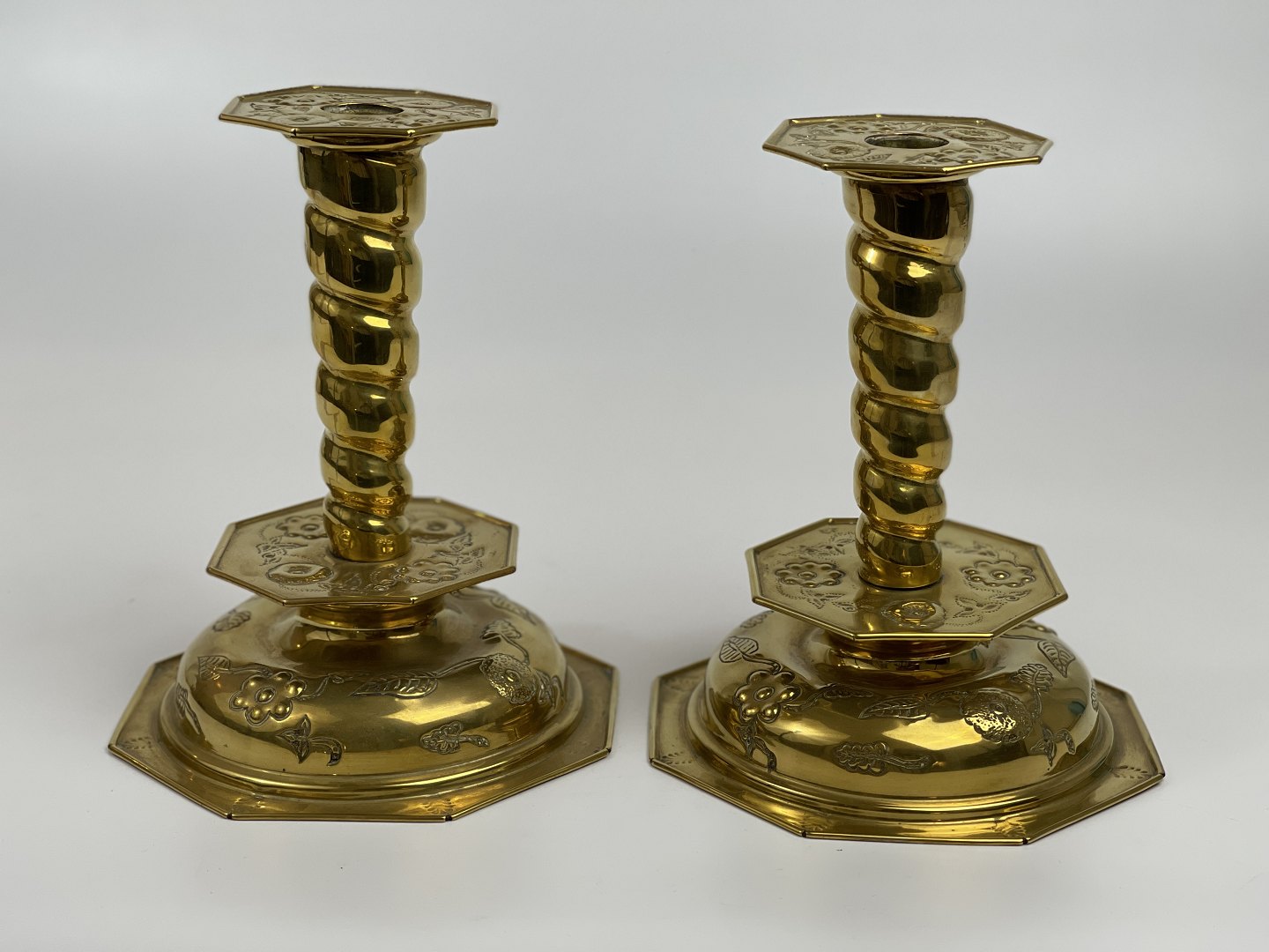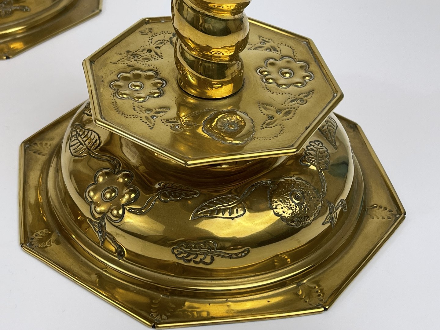 Par smukke, ottekantede lysestager, barok-form, messingblik af høj kvalitet med blomster og blade i ranker