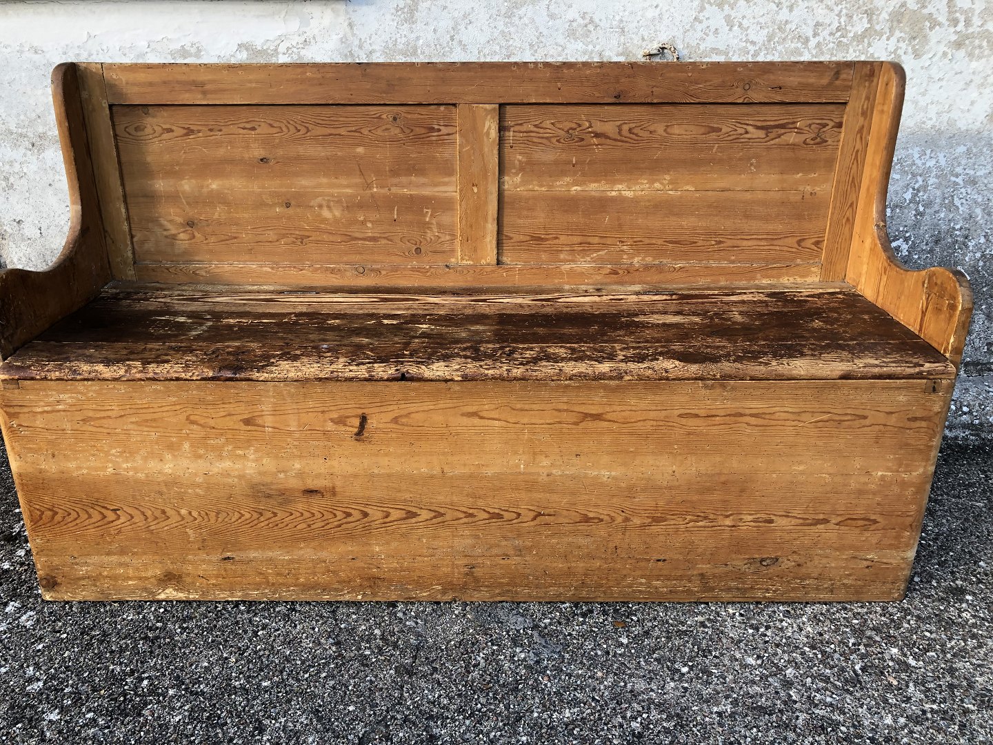 Older fine patinated kitchen bench in pine wood. Has reinforcement / repair under the lid. Dimensions: 159x91x44 cm