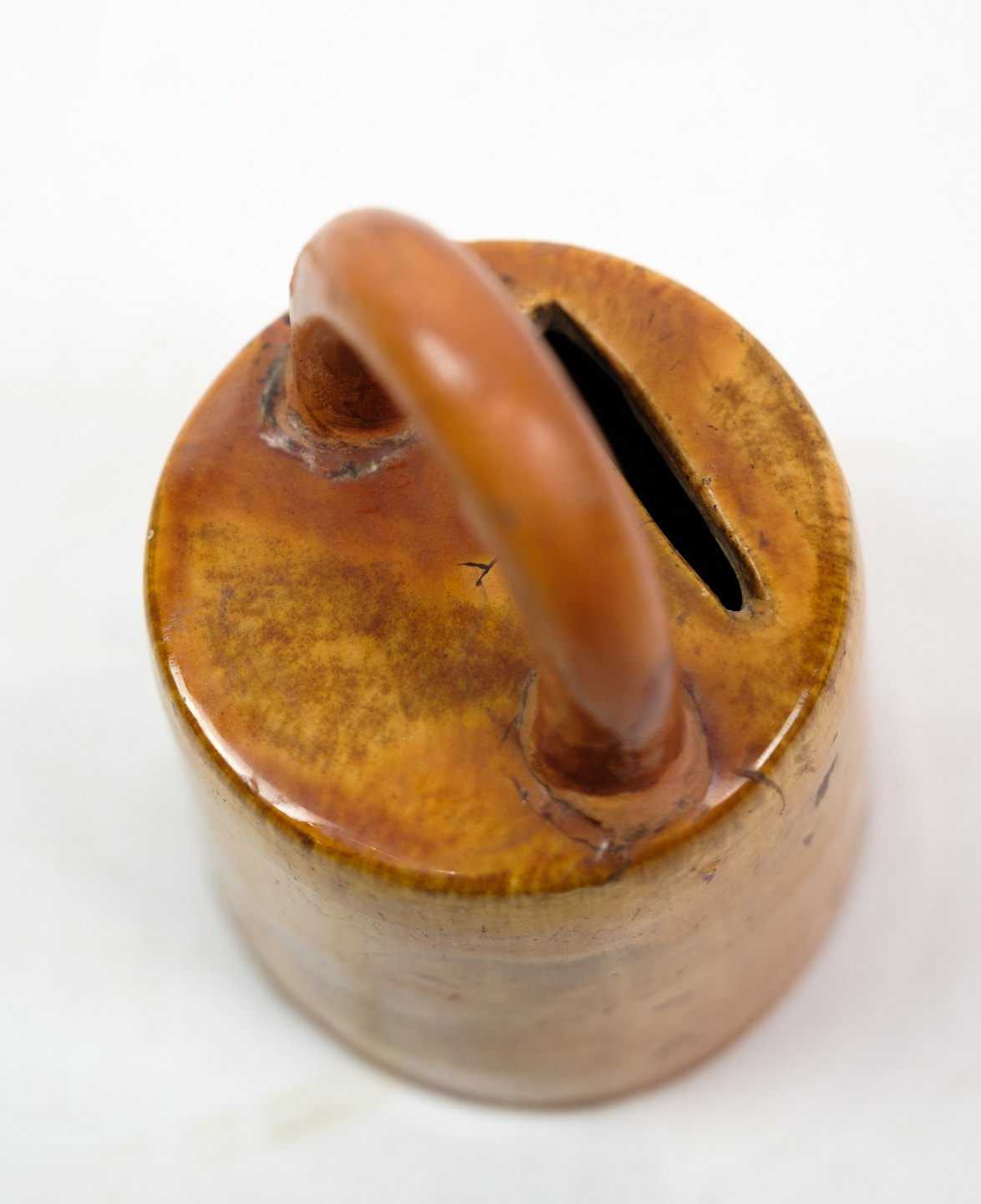 Sparebøsse af dansk design i keramik med en gul glasur fra omkring 1950'erne. Står i fin brugt stand.