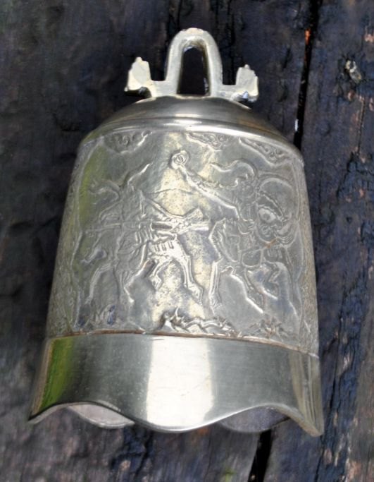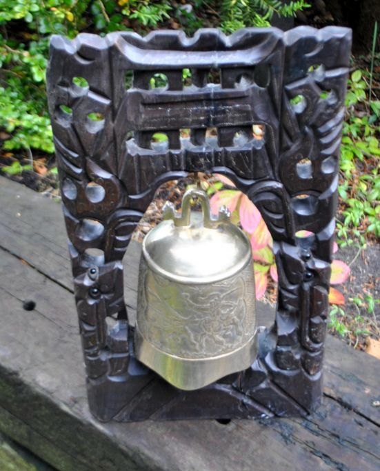 Chinese gong gong, 20th century. Bell in ore. Suspension in black wood with silver inlays. Decorated with dragons. Suspension: 43 x 25 cm. Bell decorated with warriors, fishermen and readers. H.: 18 cm. Dia.: 11.5 cm.